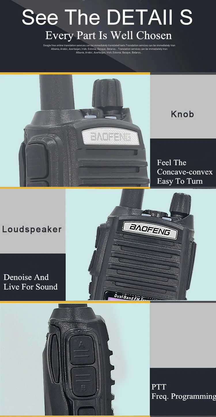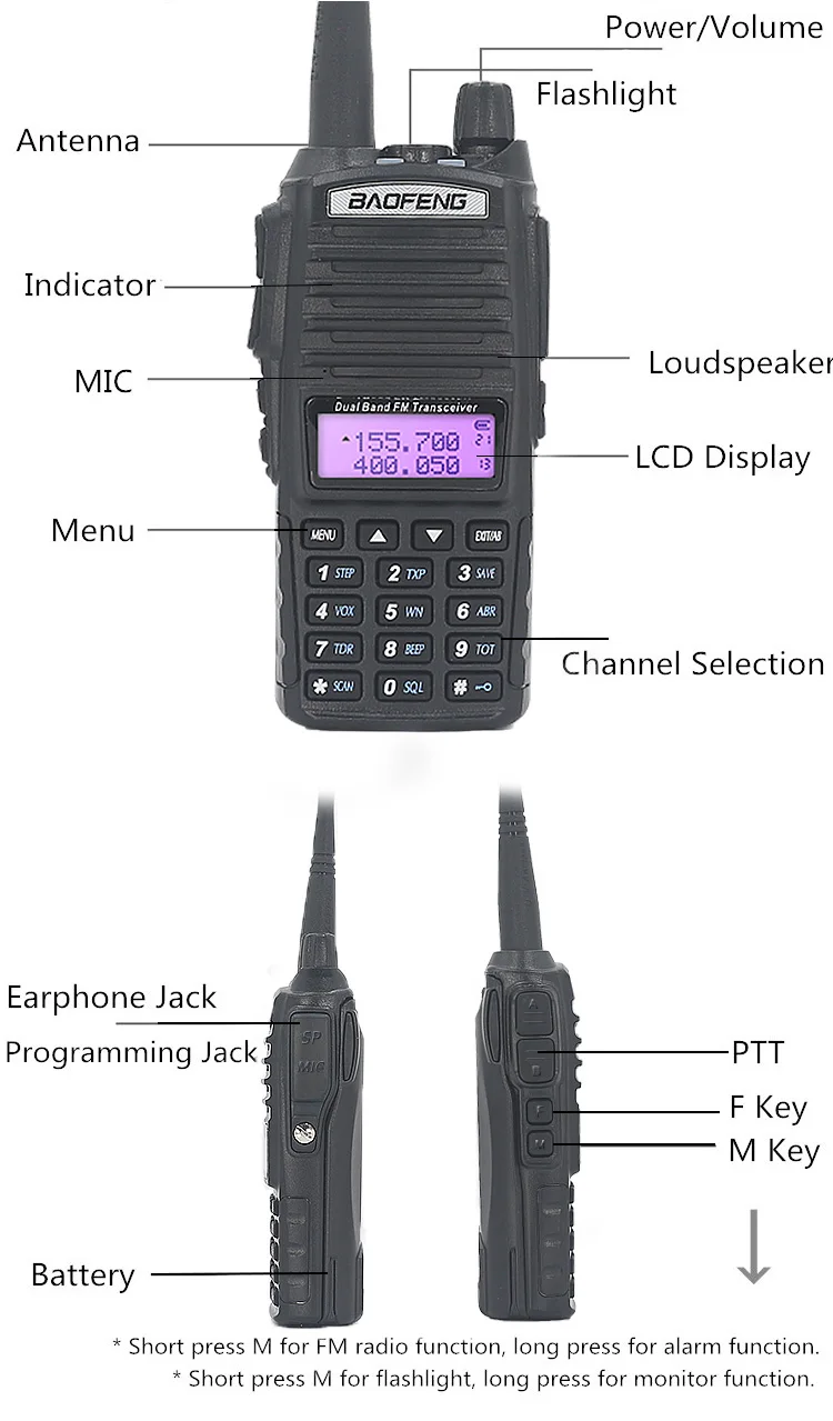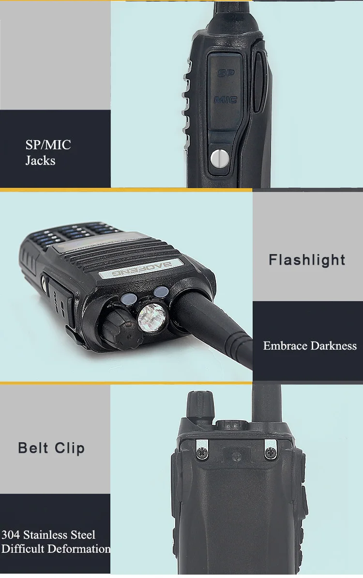 ОбщийFm-радио: 65-108 МГц (только fm-приемник)Частотный диапазон: УКВ 136-174 МГц и УВЧ 400-520 МГц (TX/RX)Канал: 128Стабильность частоты: ± 2,5 ppmАнтенна: Двойной диапазон с высоким коэффициентом усиленияСопротивление антенны: 50 ΩОперационной Напряжение DC 7,4 в <2800 мА/ч, максПростой или полудуплексный режим работыАнтенна: SMA -FemaleТип наушника/микрофона: Тип K-PlugРазмеры (Ш x В x Г): 132*60*35 мм (размер без антенны)Вес: около 220 г (включая батарею и антенну)Вход адаптера питания: AC100-240V, 50-60 Гц;Выход: DC10V/500mAТип штепсельной вилки адаптера: США/ЕС/Великобритания/Австралия на выборПередатчикВыходная мощность: 8 Вт/4 Вт/1 Вт (макс. 8 Вт)Режим модуляции: 16kΦF3E / 11kΦF3EМаксимальное отклонение: 5 кГц (ширина)/2,5 кГц (узкий носок)Порочное излучение: 7 мкВПрилегающий канал. Мощность: ≤-65 дБ (широкий) / ≤-60 дБ (узкий)Характеристики предварительного акцента: 6 дБТок ≤ 1,6a (5 Вт)CTCSS/DCS отклонение: 0,5 ± 0,1 кГц (ширина)/0,3 ± 0,1 кГц (узкий носок)Чувствительность посредника: 8-12 мВИскажение посредника: ≤ 10%