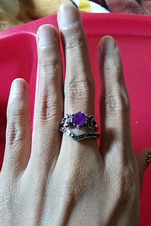 во-первых, минус звезда за то, что камень не тёмно-фиолетовый как на фото, а скорее розовый, фуксия, и толстоваты сами кольца немного, во-вторых, заказала 7 размер, но потом поняла, что лучше было б 6, в итоге так и получилось.. (сразу же написала продавцу, чтобы отправил 6, а не 7, но он меня так и не понял ни на русском, ни на английском разными словами, либо не захотел пойти навстречу, поэтому минус звезда за общение), а так за такую цену грех жаловаться, давненько таких цен на Алике не встречала, 2 достаточно качественных колечка меньше, чем за полтос - это подарок, конечно :)