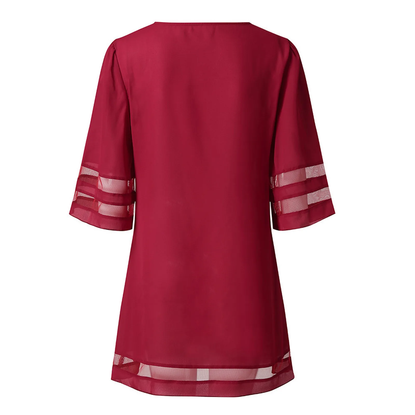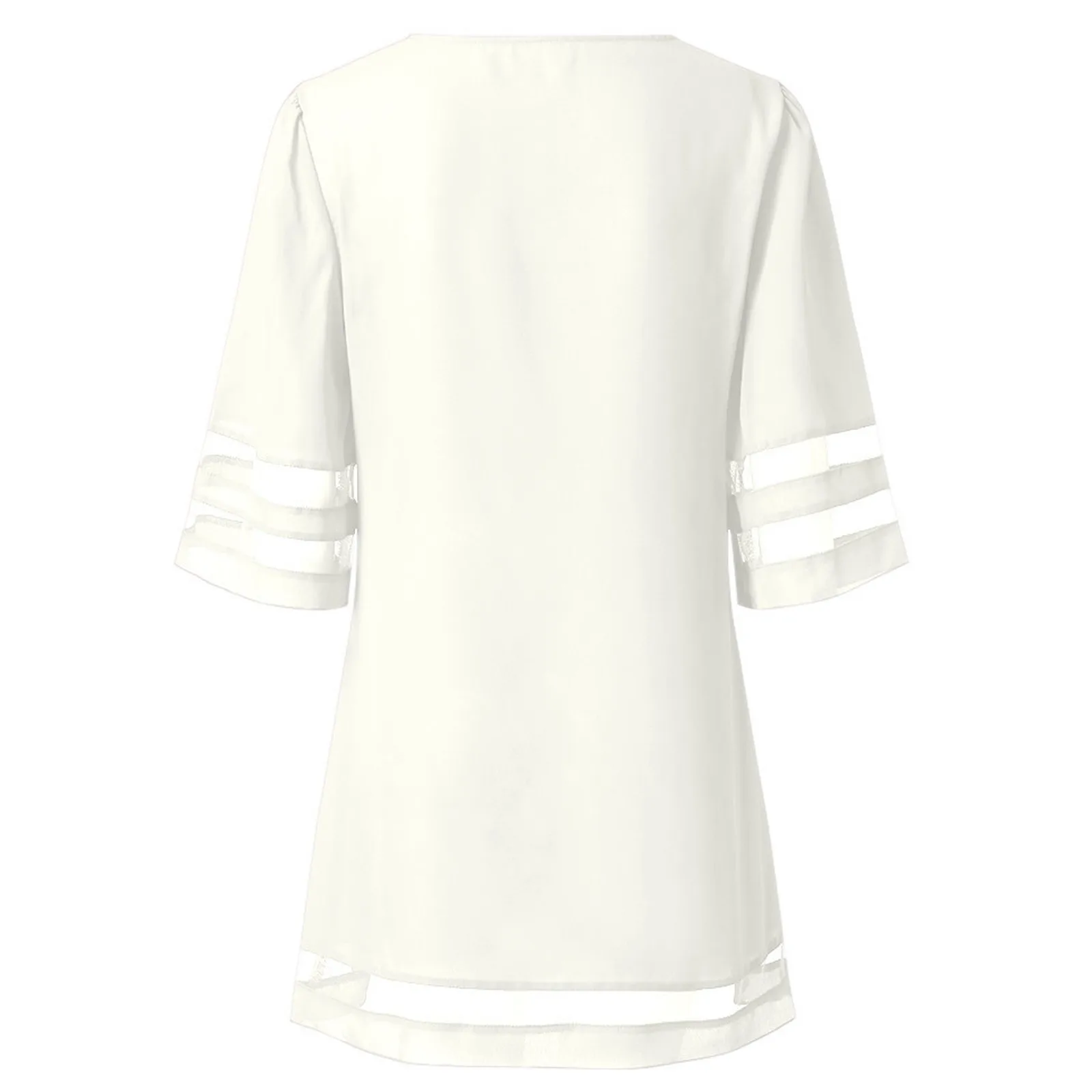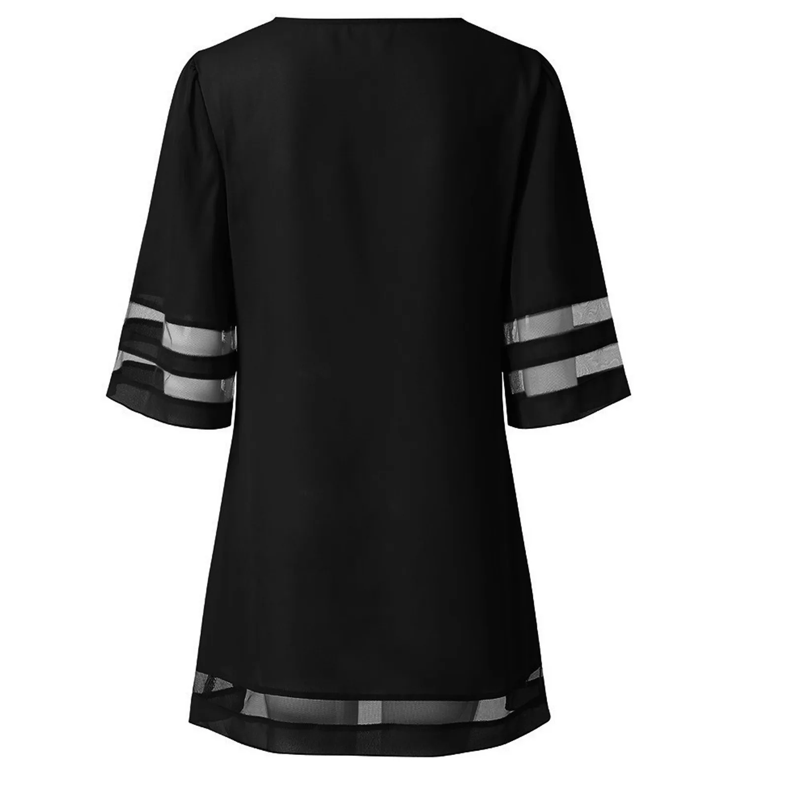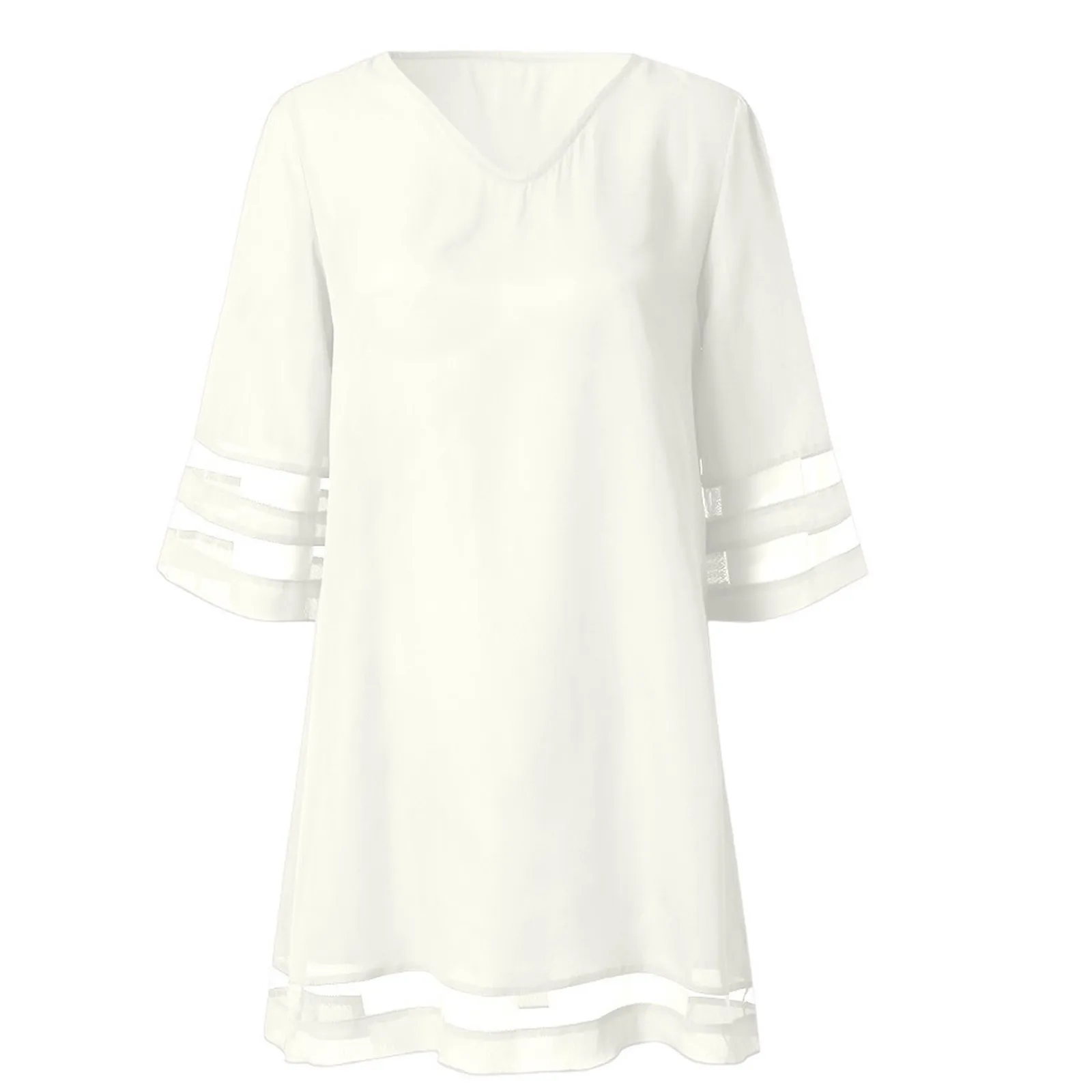 Женская сетчатая блузка с v-образным вырезом и рукавом-колокольчиком 3/4, свободное модное платье