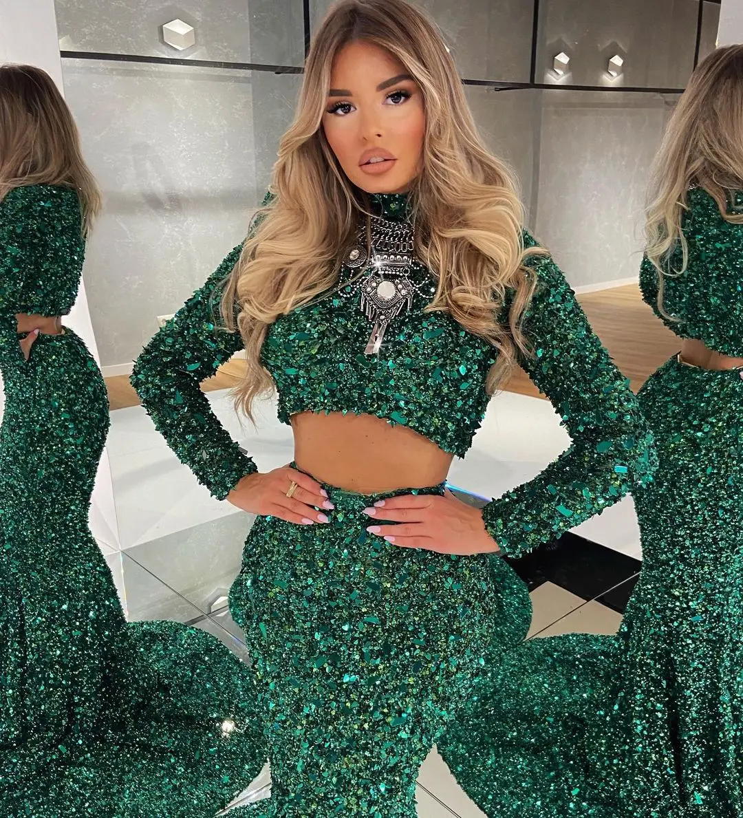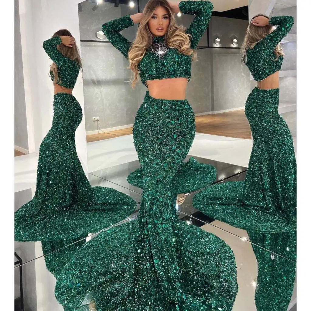 Блестящие сексуальные платья для выпускного вечера из двух частей с длинными рукавами блестками длинное вечернее платье русалки женские элегантные наряды на заказ