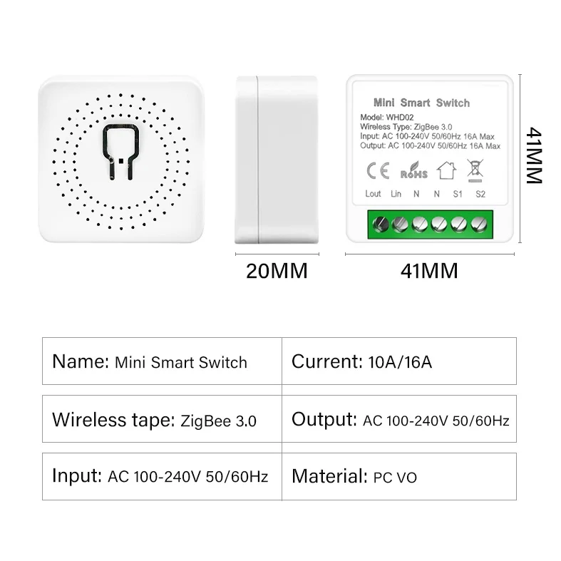 1. Умный мини-переключатель ZigBee разделен на 10A и 16A, 16A подходит для большего количества силового оборудования. Вы можете использовать смарт-переключатели на бытовую технику и светильник, чтобы вы могли включить или выключить устройство на свой мобильный телефон. Также могут быть созданы таймеры, Голосовое управление (Alexa, Google assistant, Siri) и смарт-сцены. Мини-фигурка может поместить смарт-переключатель в кассету, поэтому его не нужно размещать за лампочкой-светильник. Поддерживает три способа подключения, без переключателя/односторонний переключатель/двусторонний переключатель. (Требуется нейтральный провод)