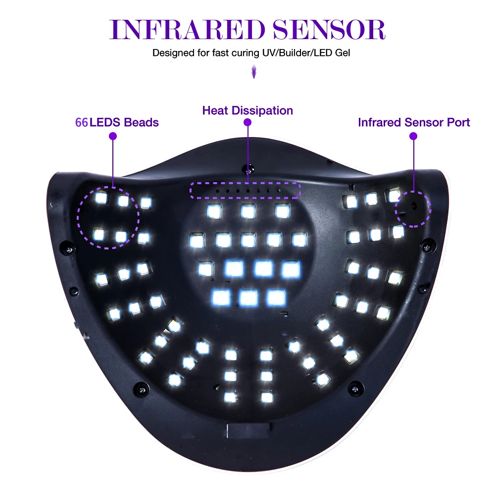 Материал: АБС-пластикВход: 100-240V 50/60HzРазмеры: 22,5*19,5*9,5 смСветодиодный: 66 УФ-светодиодныйТип геля: УФ-гель/светодиодный гель/удлинительные гели
