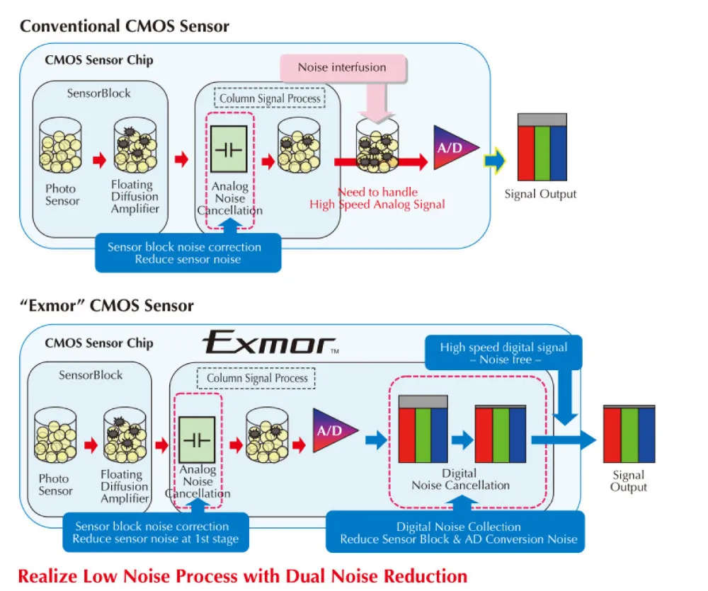 1. Как вы можете видеть из приведенной выше схемы, датчик Exmor имеет 2 процесса снижения уровня шумаВключая Аналоговое шумоподавление и цифровое шумоподавление, в то время как традиционнаяТолько Аналоговое шумоподавление.