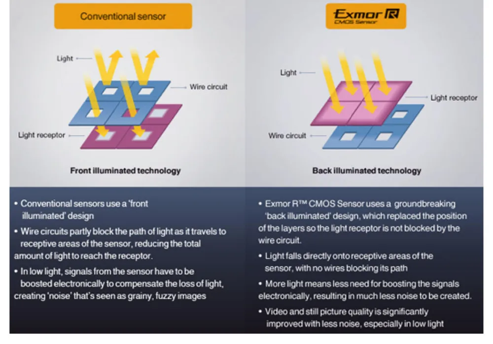 Sony еще больше улучшила возможности cmos-датчика, разработав заднюю подсветкуСтруктура, с целью создания камеры, способной делать исключительные фотографии дажеСвеча. "Exmor R" примерно в два раза чувствительнее, чем обычная Передняя подсветкаДатчик CMOS, а также имеет низкий уровень шума. В заднем светящемся cmos-датчике, светильник направляетсяНа силиконовую подложку сзади, что позволяет использовать светильник с уровнем эффективностиВозможно с обычными фасонными пиксельными конструкциями. Фотографы теперь могут создаватьГладкая, высокое качество изображения в условиях низкой светильник настройки, в том числе ночных сцен.