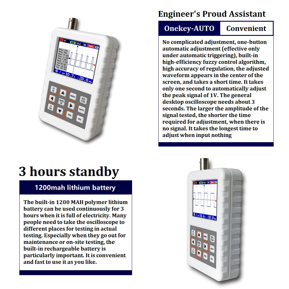 Ключевые особенности:1: технология сжатия памяти, экран обновления формы волны не мерцает2: технология отображения после свечения3:2.4 дюймовый цветной экран4:5 МГц аналоговая полоса пропускания @ 20 мс/с частота дискретизации5: быстрое хранение сигналов6: встроенная память 16 м, максимальное хранение 500 изображений формы волны7: мощный файловый менеджер сигналов, поддержка просмотра эскизов, просмотра, просмотра деталей, флип, удаления и других функций8: Диапазон высокого напряжения, 1X может измерять 0 ~ 40 В, 10X может измерять 40 ~ 800 в9: до 11 параметров измерения: VPP,Vmax,Vmin,Vavg,Vrms, частые, Duty +,Duty-,Time +,Time-,Time10: в любое время дисплей формы волны (Функция паузы) заморожен11: Оснащен высокой эффективностью одной кнопкой авто12: Полная функция запуска (одиночный, нормальный, автоматический)13: Встроенный перезаряжаемый литиевый аккумулятор емкостью 1200 мАч может непрерывно заряжаться в течение 3 часов одновременно14: дневной режим и ночной режим15: Ультра маленький объем, легко носить с собой