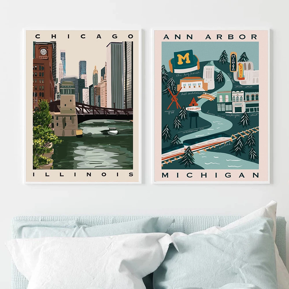 Скандинавский постер путешествия городская искусство на стену Чикаго Энн Арбор Мичиган пейзаж холст живопись Настенная картина домашний декор