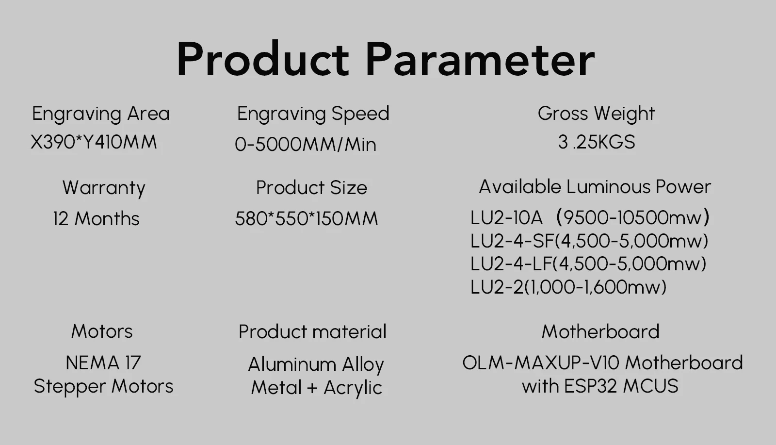 При мягком отключении машины, это уменьшит мощность до лазерного модуля● LaserGRBL (бесплатное программное обеспечение) поддерживает Windows XP, 7, 8, 10. LaserGRBL является самым популярным программным обеспечением для резьбы в мире, может импортировать различные форматы изображений, вы можете редактировать в PhotoShop, Inkscape, CAD и т. Д., а затем подключаться к граверу с помощью лазерного LaserGRBL для гравировки и резки.● LightBurn (не бесплатное программное обеспечение, lightburnsoftware.com) поддерживает Windows, Mac OS и Linux. Это самое популярное Платное программное обеспечение для резьбы в мире, очень простое в использовании.● Этот лазерный гравер поддерживает режим PWM.● Предварительно собранные детали, просто нужно 10 - 20 минут для установки машины.● 390x410 мм большая площадь гравировки.● Рама из алюминиевого профиля + структурный кабель, прочная структура, плавная работа, привлекательный внешний вид● Синхронизация механической структуры вала, избегайте синхронизации на двух y-рельсах во время полноскоростной гравировки.Спецификация:● Материнская плата: 32 бит MCU материнская плата● Прошивка: Ortur Laser Master прошивка● ОС верхнего компьютера: Windows (работает с LaserGRBL ), MAC OS и Linux (работает с LightBurn)● Длина волны: 445 ± 5 нм● Формат ввода: NC, BMP, JPG, PNG, DXF и т. Д.● Площадь Резьбы: X: 390 мм x Y: 410 мм● Скорость резьбы: 5000 мм/мин и меньше● Размер изображения: нет ограничений (точность пикселей может быть свободно отрегулирована, и по умолчанию 300 пикселей на дюйм, это около 0,81um точность пикселей)Примечание:● Пожалуйста, носите очки при работе с лазерным гравером. Надевайте защитные очки, чтобы избежать слепоты.● Пожалуйста, не прикасайтесь к лазерному излучателю рукой, иначе он может сжечь вашу руку.● Пожалуйста, избегайте сильного воздействия на машину.● Детям до 14 лет не разрешается использовать этот продукт, и детям старше 14 лет требуется наблюдение за взрослыми.● Гравировальный светильник не может быть непосредственно применен к любому зеркальному отражающему объекту, что может привести к травме оператора или сжечь лазер.● Этот продукт не рекомендуется для промышленной резки из-за высокой скорости гравировки.