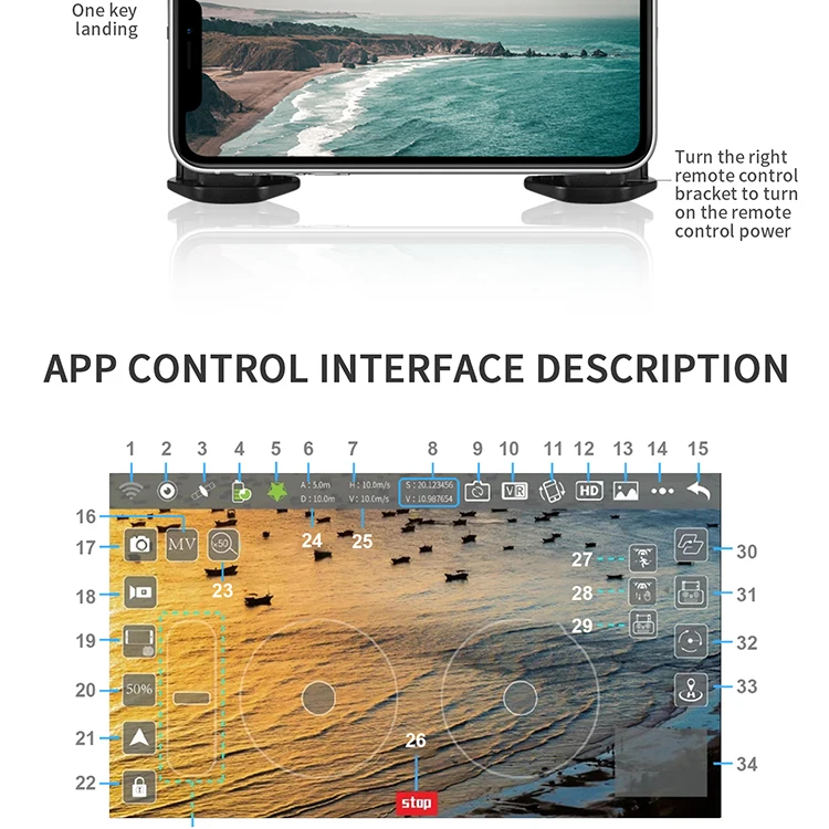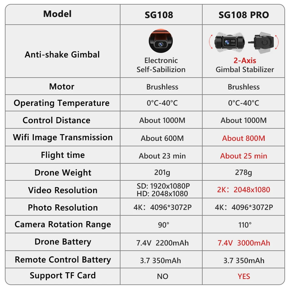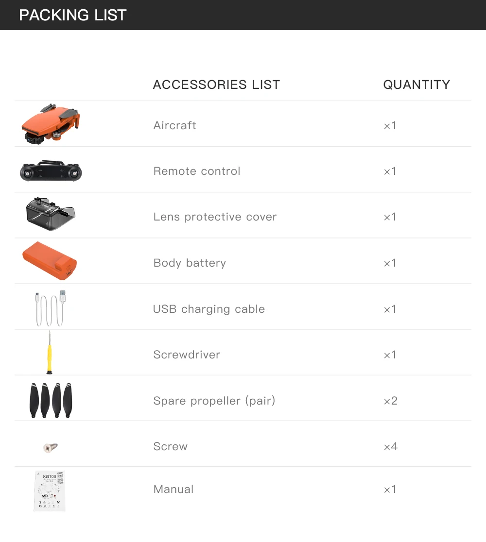 Особенности: Спецификация (SG108 PRO) Камера: 2 карданный стабилизатор для Камера Расширение: 25*30,2*5,7 см Складной: 13*8,3*5,7 см Разрешение видео 4K:4096*3072P Разрешение фото 4K: 4096*3072P Камера пониженного обзора: 1280*720p Частота кадров: 25 кадров в секунду Фокусное расстояние: 50x зум Время полета 28 минут Расстояние полета 1000 метров (без помех, без препятствий) Частота дистанционного управления: 2,4 ГГц Аккумулятор дистанционного управления: Встроенный аккумулятор 300 мАч Время зарядки 120 минут Емкость аккумулятора: 7,6 в 2200 мАч литиевая батарея Камера 4K HD Расстояние передачи WiFi: 800 метров (без помех, без препятствий) Распознавание Жестов: 1-3 metersGPS следование: около 30 метров Особенности продукта Двухосевой стабилизатор против встряхивания, GPS возврат в дом, 4K HD камера, складной корпус, один ключ для снятия, один ключ к земле, фиксированная высота, оптический поток фиксированной высоты, две камеры, подключение Wi-Fi, Управление приложениями, фото жестов, видео жестов, отслеживание изображений, Траектория полета, регулировка скорости, передача в реальном времени, возврат одного ключа, изображение МВ и обмен видео Посылка включает в себя: 1 x Квадрокоптер SG108 Pro RC 1 х пульт дистанционного управления 1 или 2/3x7,4 V 2200mAh батарея (опция) 2 пропеллера (1а + 1В) 1 х USB кабель для зарядки 1 отвертка 1 x Руководство пользователя SG108 -Двойной режим GPS/ГЛОНАСС -4K HD регулируемая камера -5G передача изображения Wi-Fi на большие расстояния -Безголовый режим -Оптический режим позиционирования потока -Передача изображения в реальном времени -Интеллектуальный контроль -Объемный полет -Полетный путь -Траектория полета -Складной портативный фюзеляж -Возврат одной кнопки -Снятие/посадка одной кнопкой -Съемка жестов -Дистанционное управление фото-и видеозаписью -Бесщеточный двигатель -Переключатель скорости -Электрический забор -Функция поиска самолетов -MV функции: фильтры, видеоэффекты, добавление фоновой музыки, обмен фотографиями/видео -Около 229 г Сверхлегкий: регистрация не требуется, что отвечает требованиям безопасности веса микро дронов в большинстве стран и регионов Посылка включает в себя: 1 x Квадрокоптер sg108 RC 1 х пульт дистанционного управления 1 или 2/3x7,4 V 2200mAh батарея (опция) 2 пропеллера (1а + 1В) 1 х USB кабель для зарядки 1 отвертка 1 x Руководство пользователя