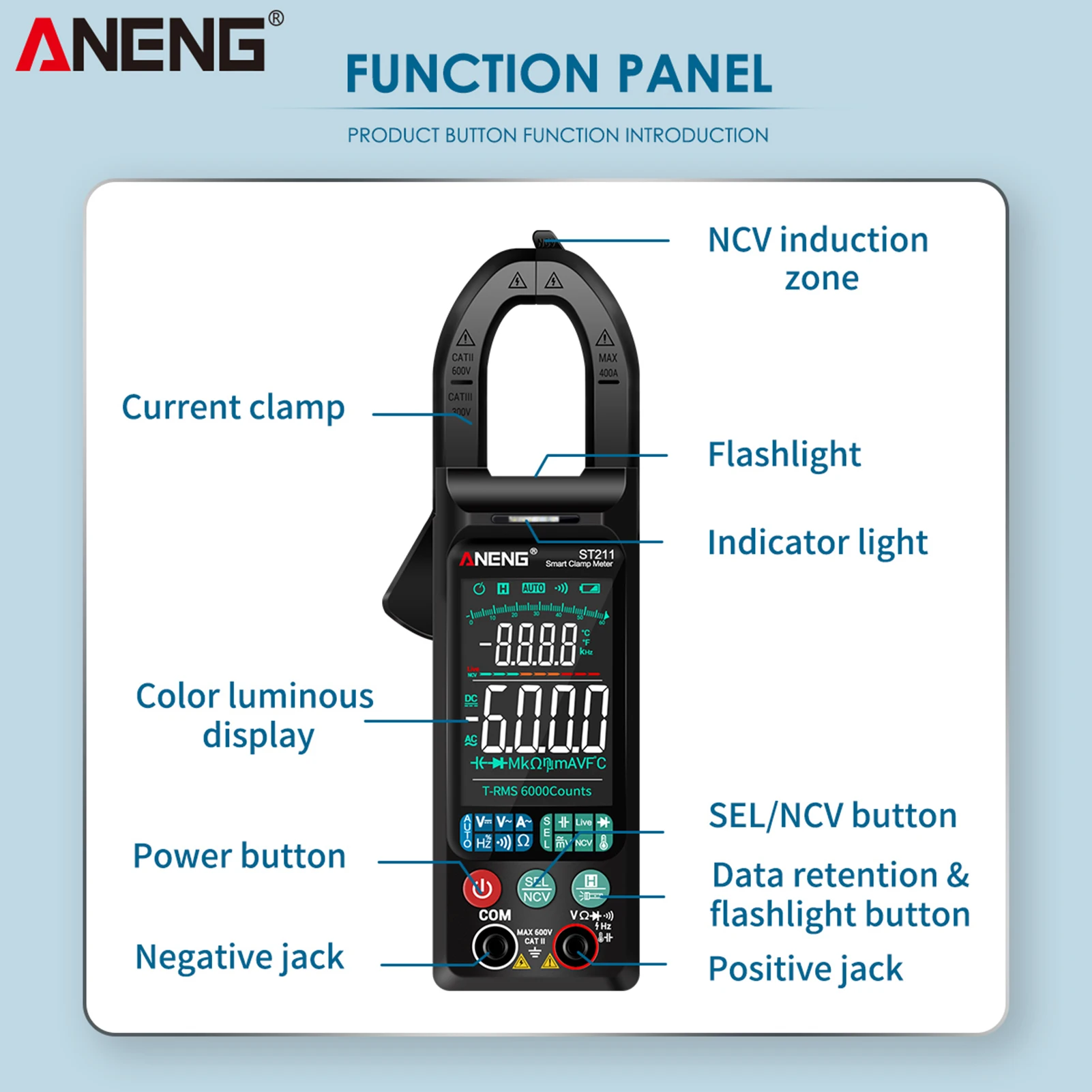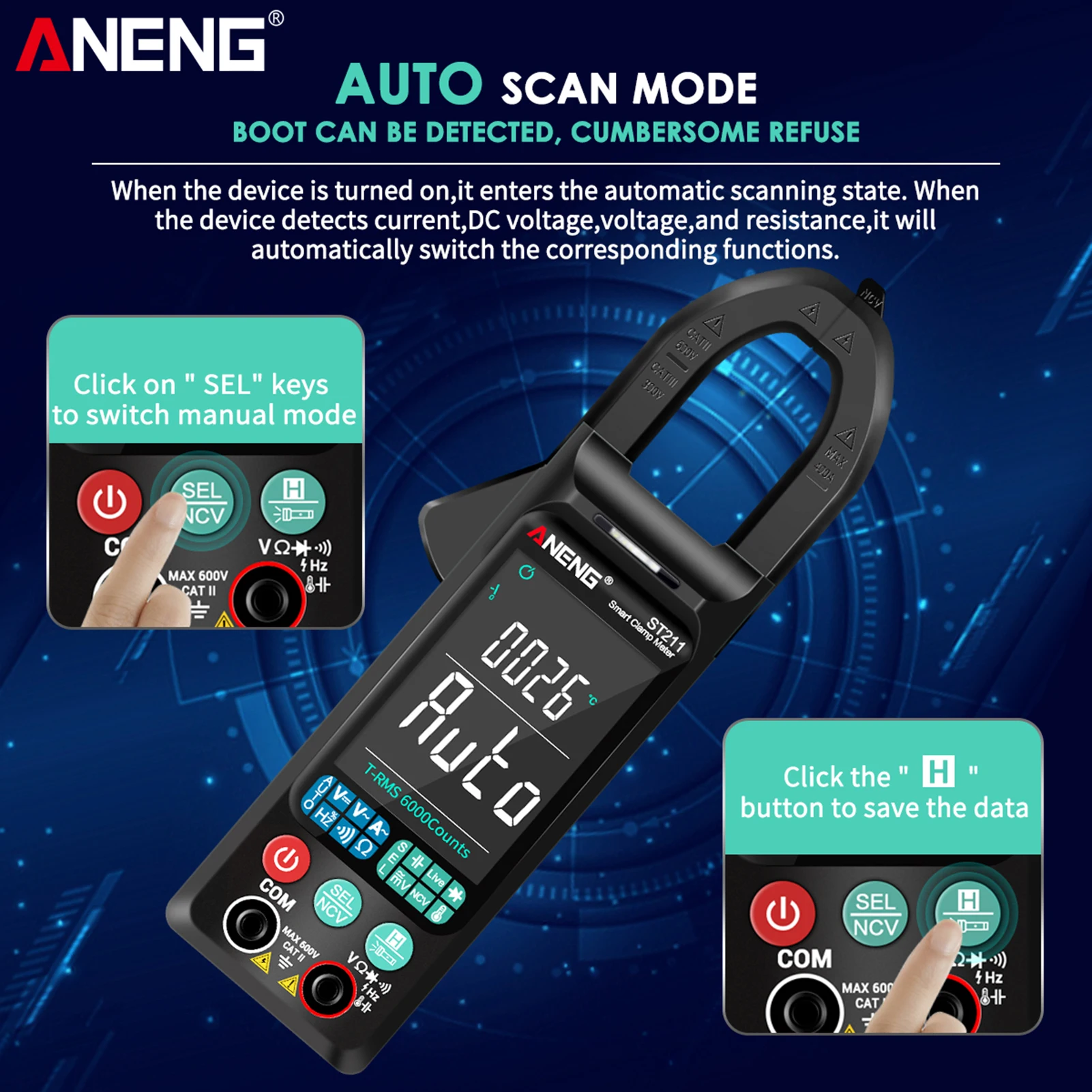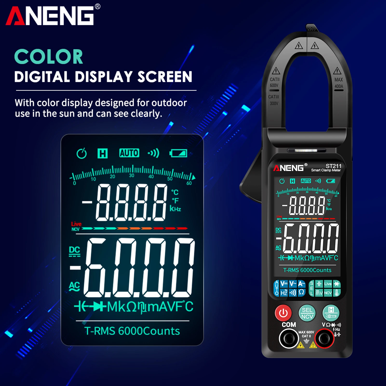 Цифровой мультиметр ANENG ST211, 6000 отсчетов, зажим-измеритель 400A, Автоматический диапазон, подсветка, измеритель напряжения, зажим, тестовый зажим NCV