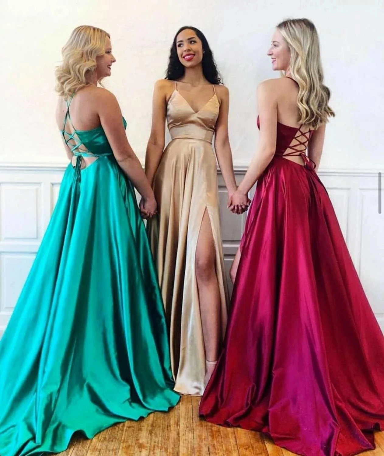 FD281 Длинные атласные платья цвета шампанского с Боковым Разрезом для выпускного вечера с карманами Макси V-образный вырез сексуальная спина Формальное вечернее платье вечерние платья