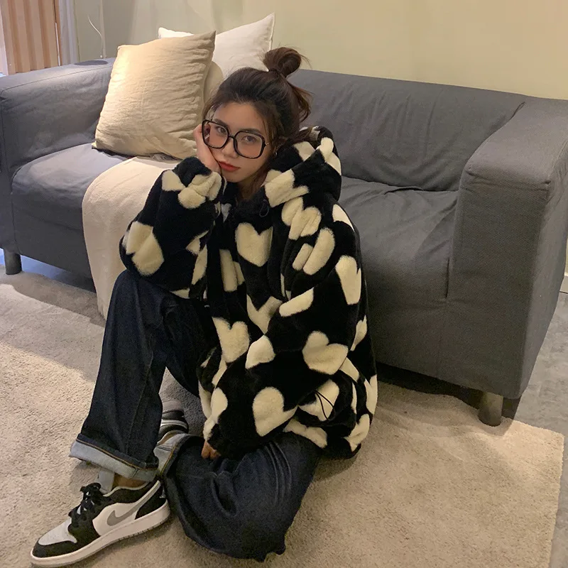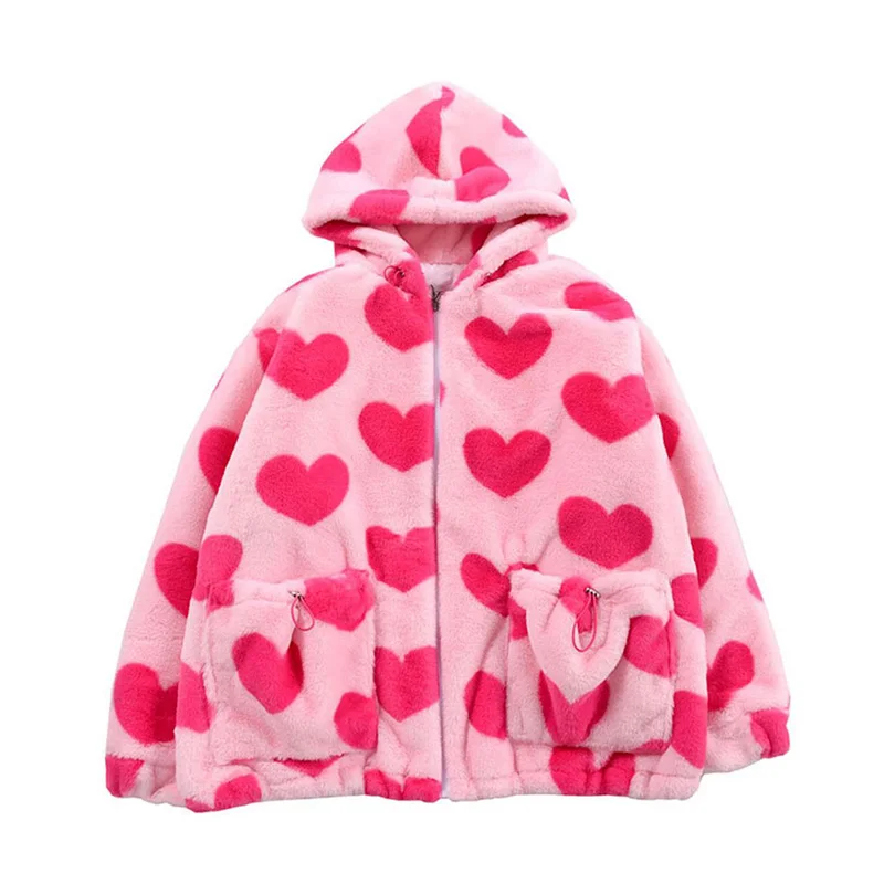 Женская плюшевая куртка в стиле Харадзюку 90-х годов с принтом в виде сердца, Женское зимнее пальто из искусственного меха с большим капюшоном и длинным рукавом, Толстая теплая уличная одежда