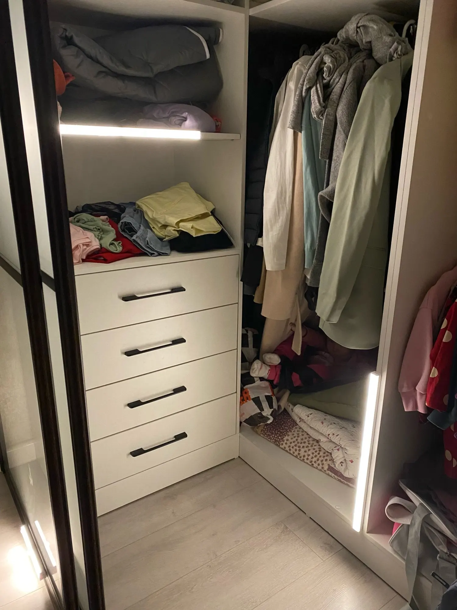 Хорошая подсветка. Сенсор чувствительный. В распашном шкафу лучше клеить не по центру, а со смещением, тк датчик через дверную щель считывает движение в темноте на расстоянии- у меня может включаться, когда ворочаюсь на кровати напротив шкафа))