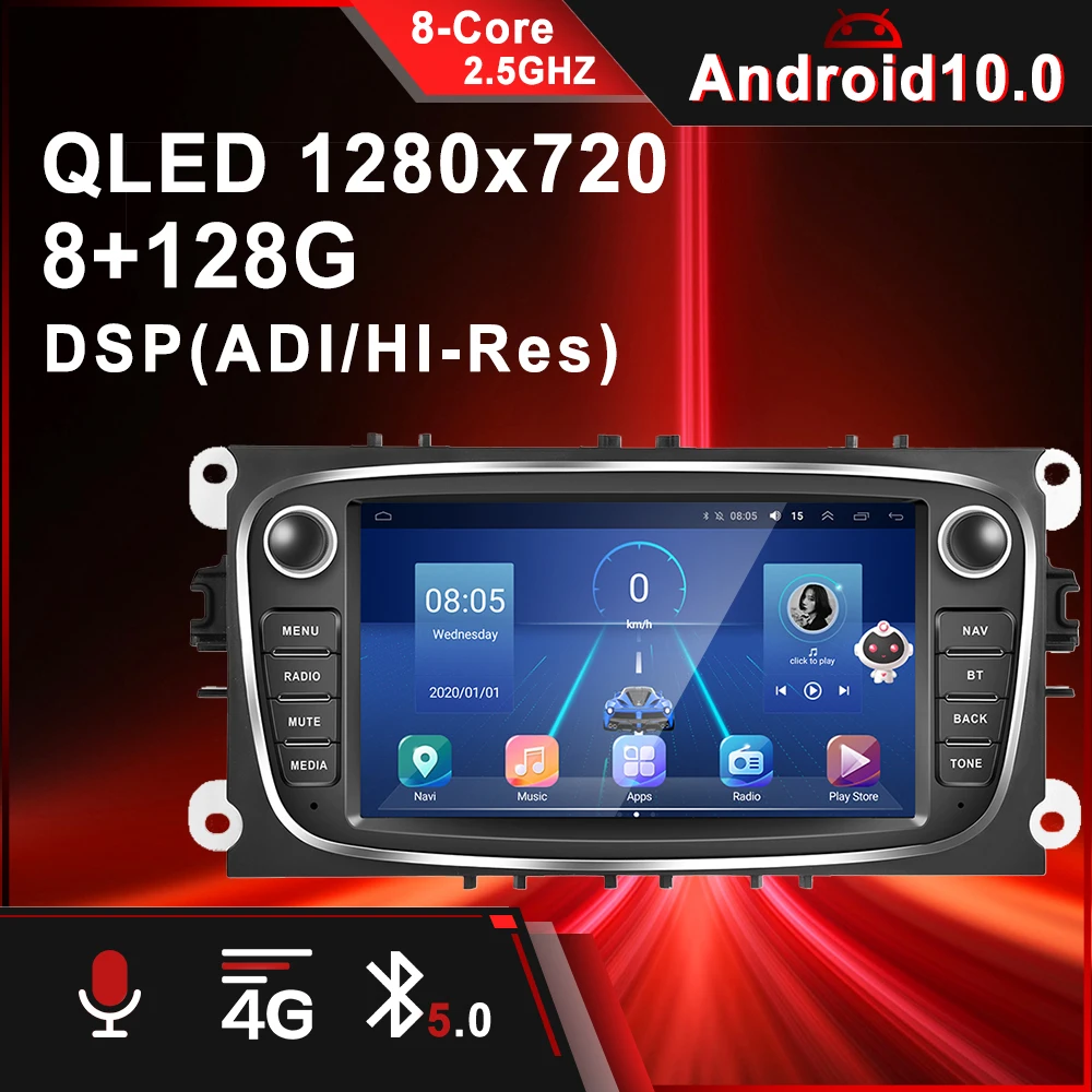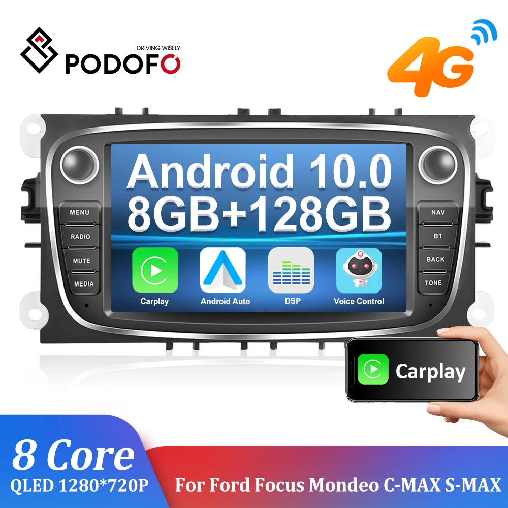 Podofo автомобильное радио Android 10 8 + 128 ГБ GPS WIFI 4G для Ford Focus S-Max Mondeo Galaxy C-Max 7-дюймовый автомобильный мультимедийный плеер авторадио