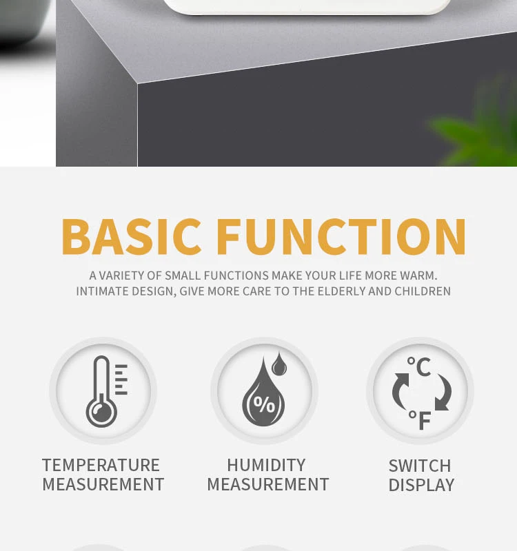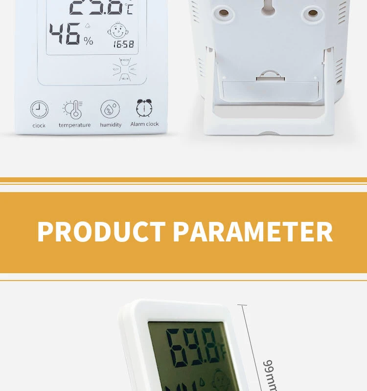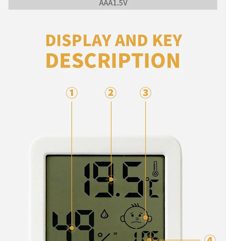 Индикатор комфорта со значком лица: температурный датчик влажности оснащен значками лица, чтобы быстро указать состояние сухого/комфортного/влажного воздуха, чтобы уведомить вас о необходимости настройки увлажнителя или осушителя воздуха соответственно и обеспечить, чтобы вы всегда были в наиболее комфортной среде
