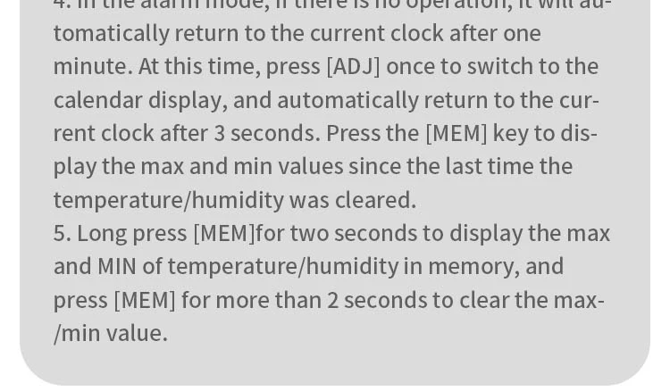 4. В режиме будильника, если нет операции, он автоматически вернется к текущему часу через одну минуту. В это время Нажмите [ADJ] один раз, чтобы переключиться на дисплей календаря и автоматически вернуться к текущему часу через 3 секунды. Нажмите клавишу [MEM], чтобы отобразить температуру/максимальные и минимальные значения влажности с момента последнего очищения.
