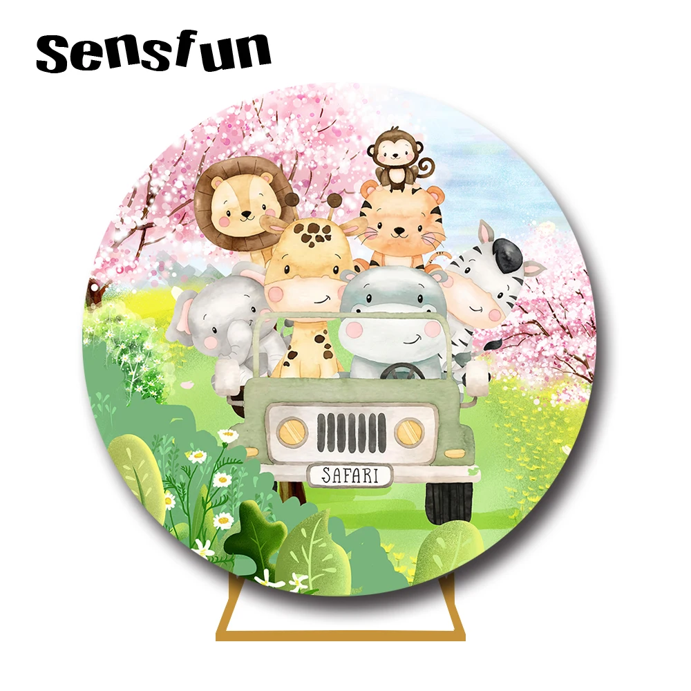 Сафари джунгли Вечеринка круглый фон крышка лев тигр слон животные автомобиль дети дикая один день рождения Круглый фон эластичный