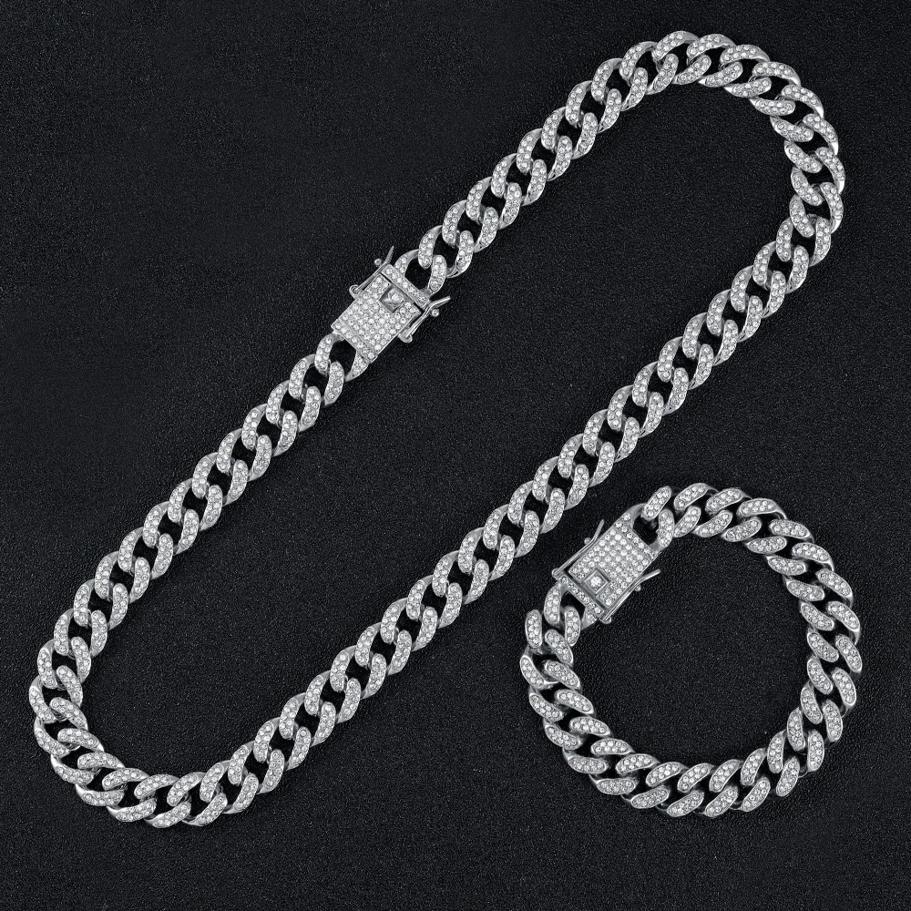 Цепочка Стразы в стиле хип-хоп Мужская, сверкающая цепь из кубинской цепи Майами в стиле хип-хоп 13 мм, серебристого цвета, сверкающие мужские ожерелья в рэперском стиле