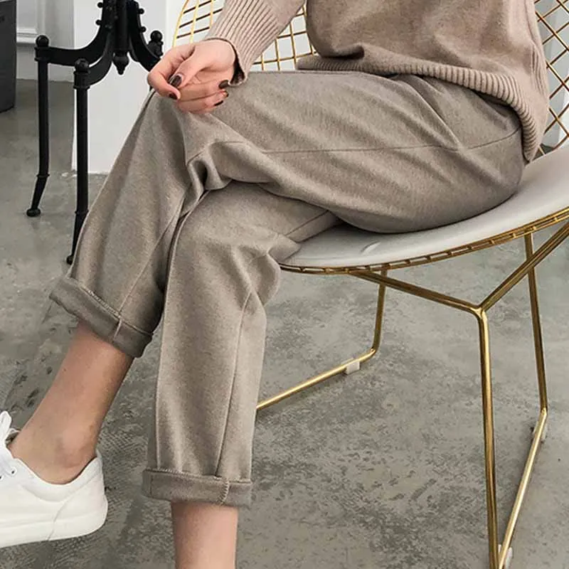 Зимние женские утепленные брюки-карандаш, повседневные теплые шерстяные брюки с высокой талией, свободные женские рабочие брюки до щиколотки, прямые брюки