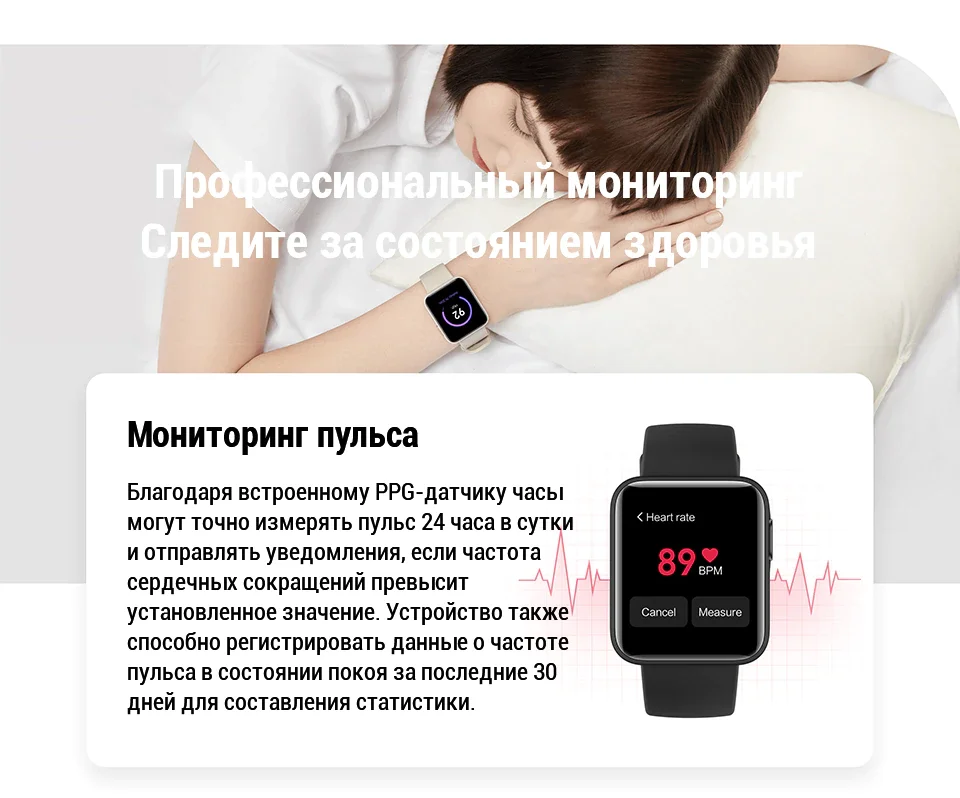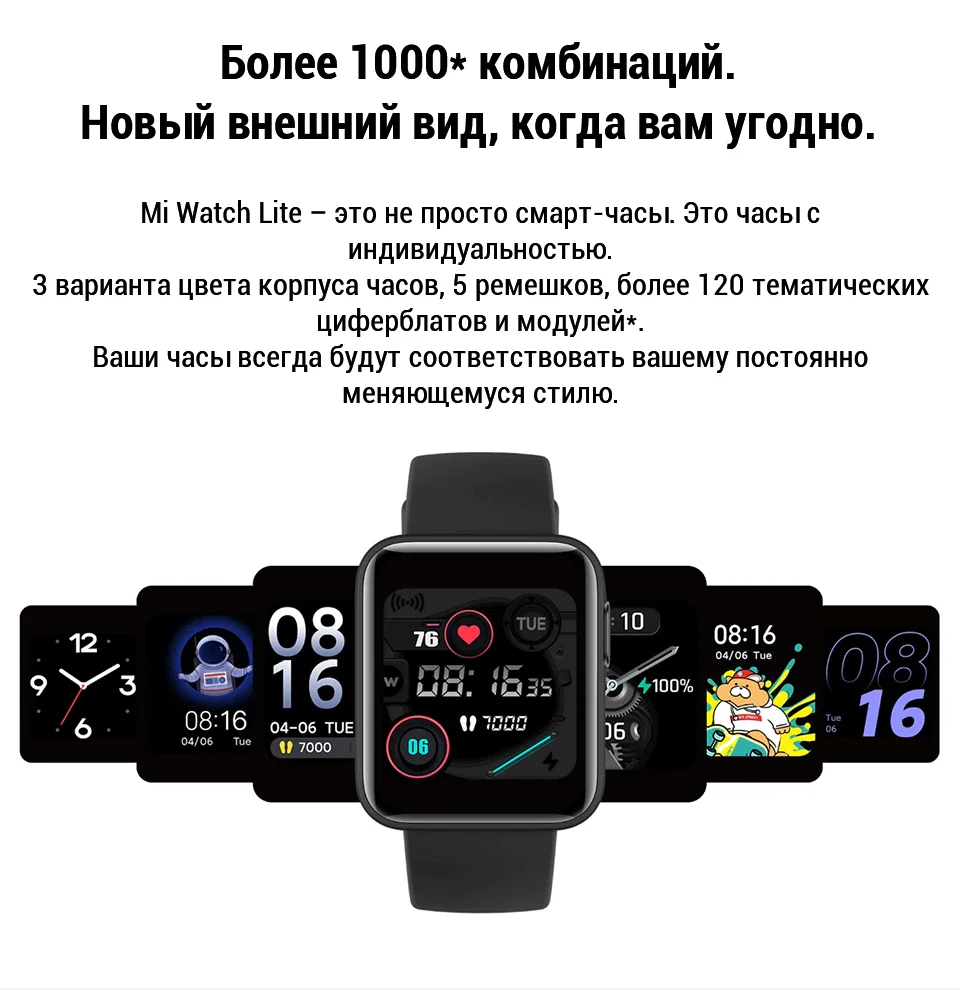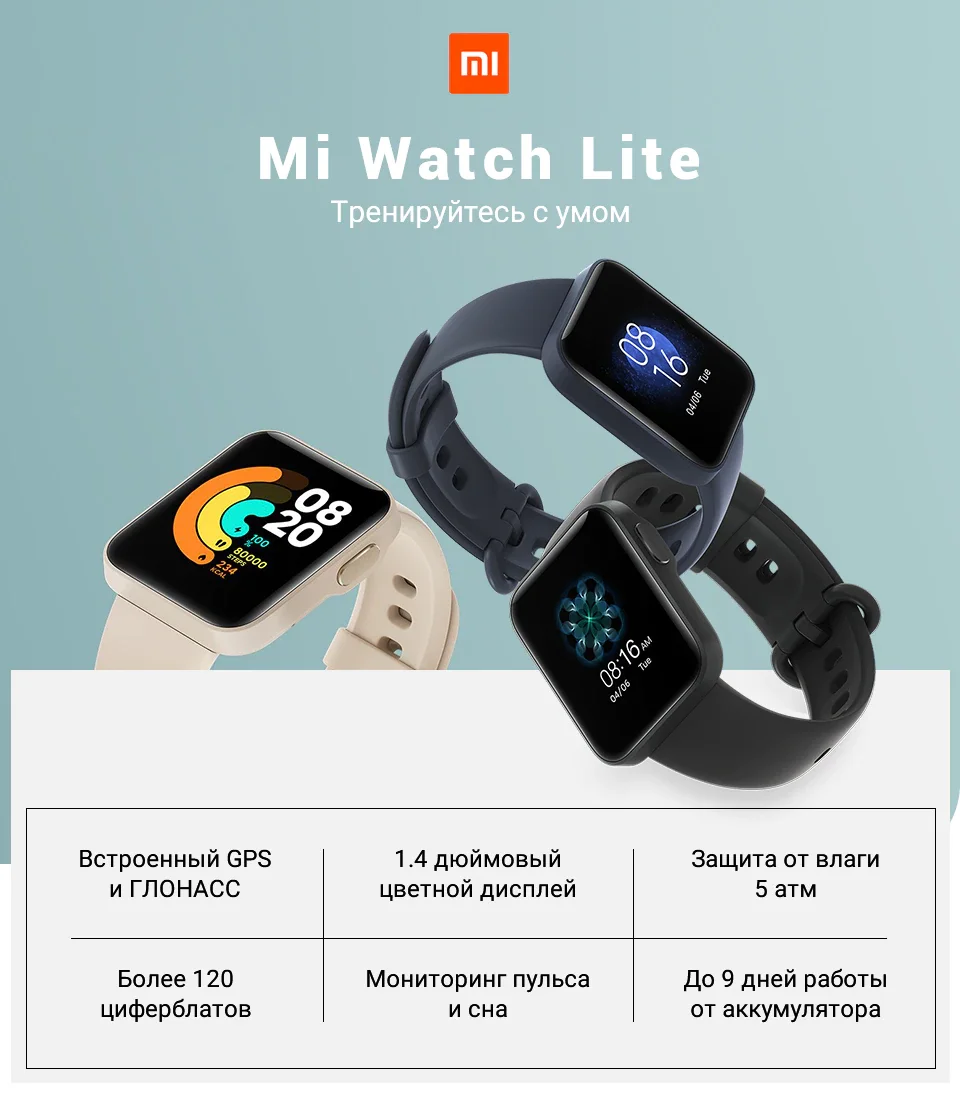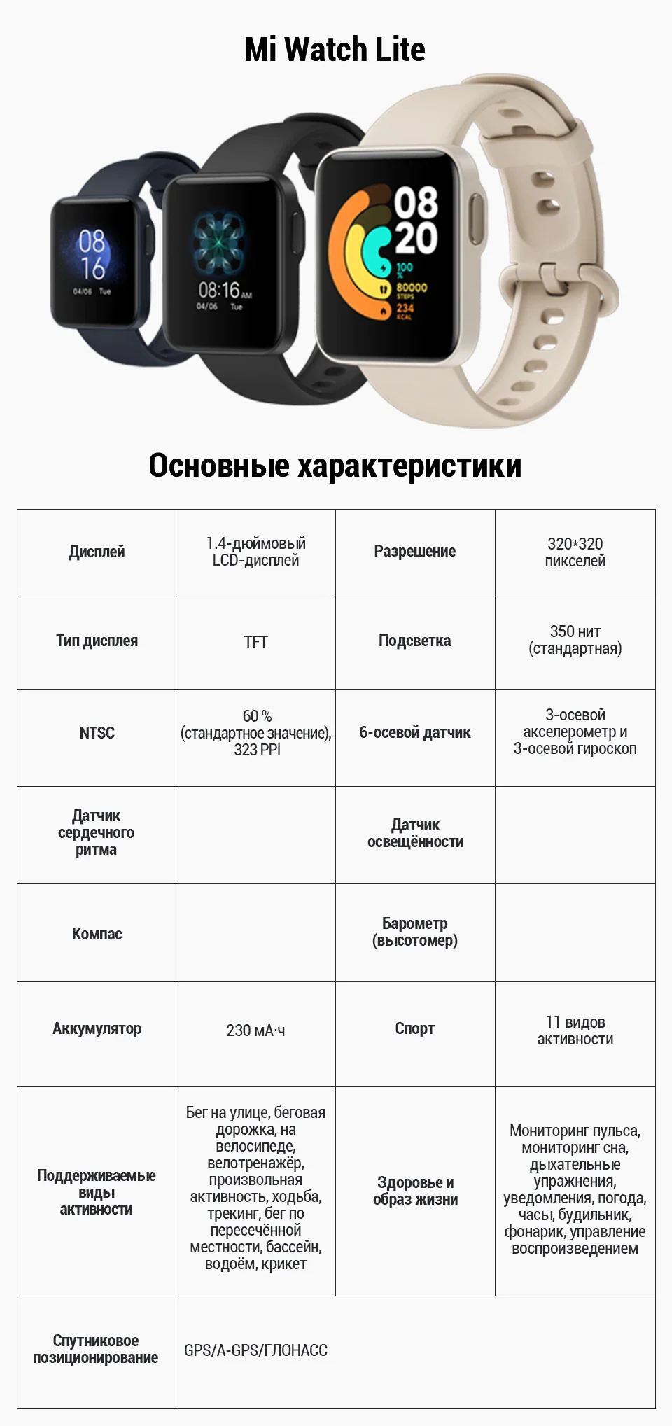 Смарт-часы Xiaomi Mi Watch Lite RU Встроенный GPS и ГЛОНАССЗащита от влаги 5 атм1,4-дюймовый цветной дисплей
