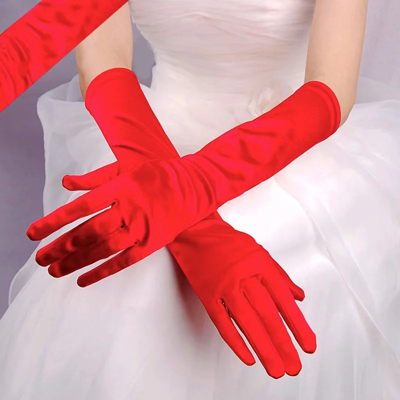 Женские вечерние деловые перчатки, однотонные атласные перчатки с длинными пальцами для мероприятий, свадебные перчатки красного, белого цветов