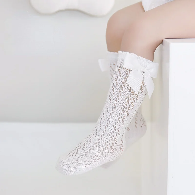 Детские летние длинные носки в комплекте, белые сетчатые хлопковые мягкие длинные носки для новорожденных с оборками и бантом, подарок принцессе на день рождения
