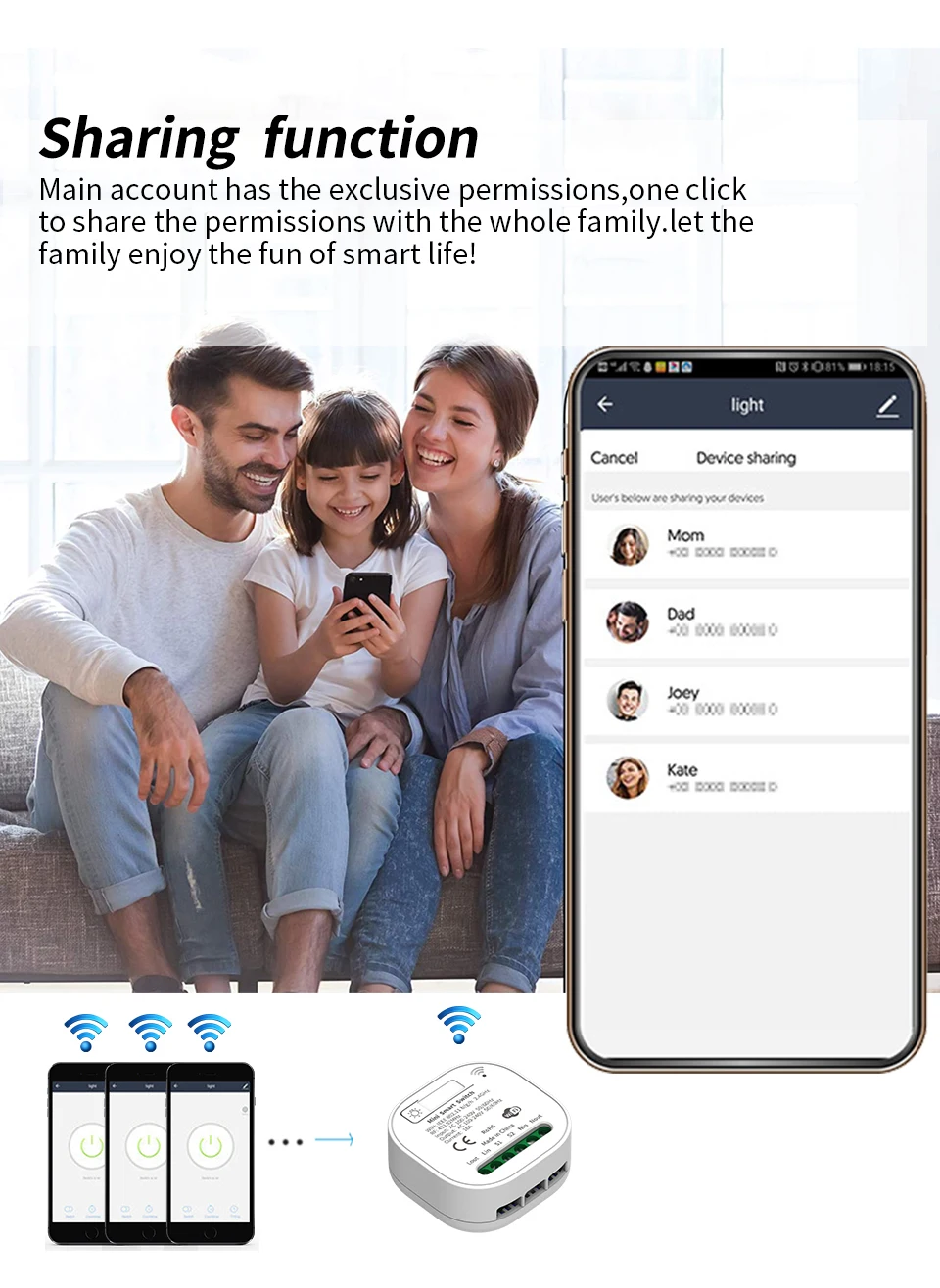 Удобная и эффективная функция группового управления позволяет передавать эти смарт-вилки всем членам семьи за минуту. Не беспокойтесь. Каждый может легко управлять им!