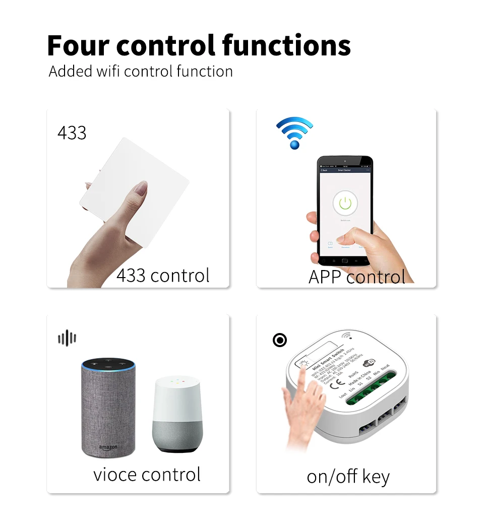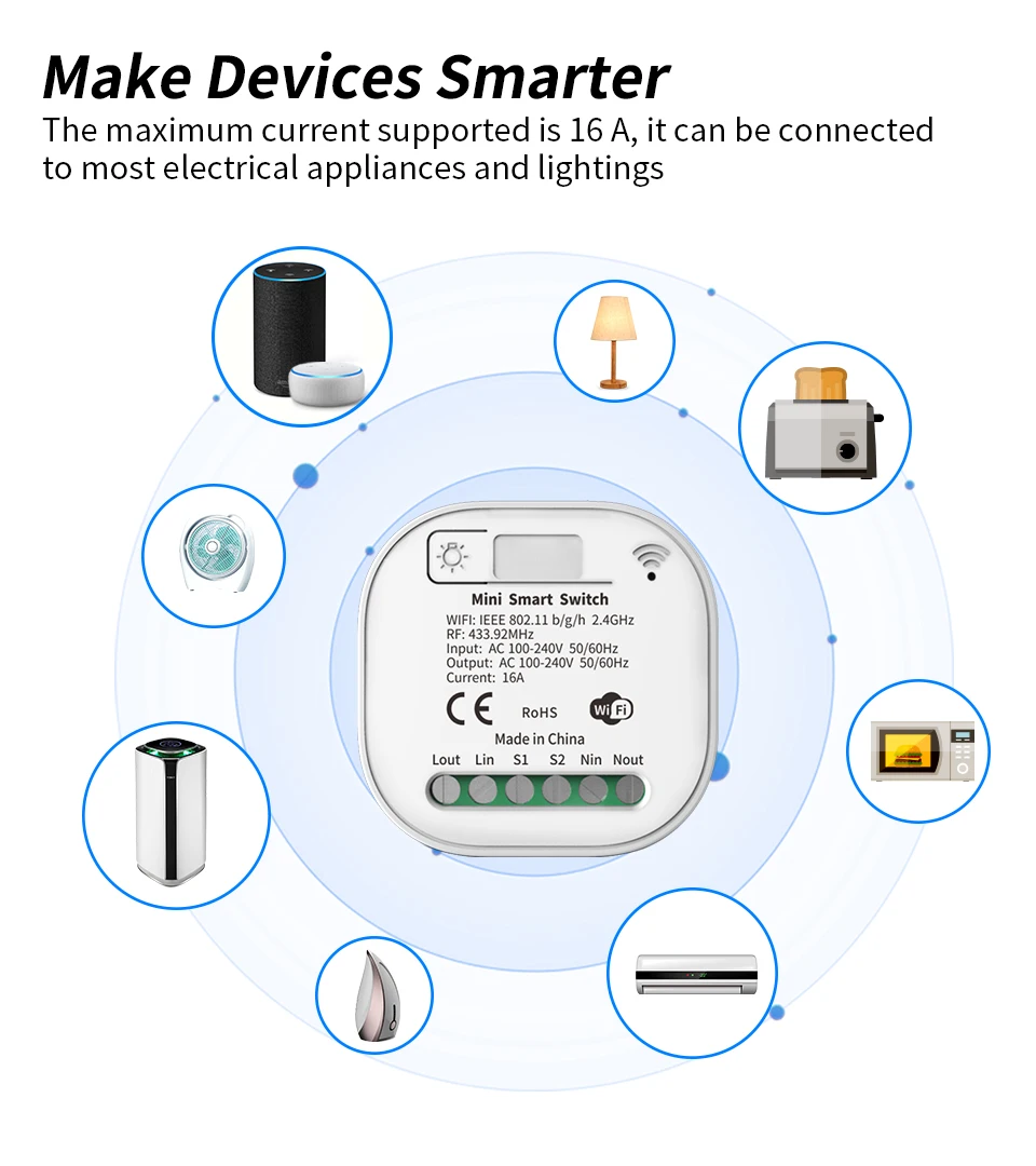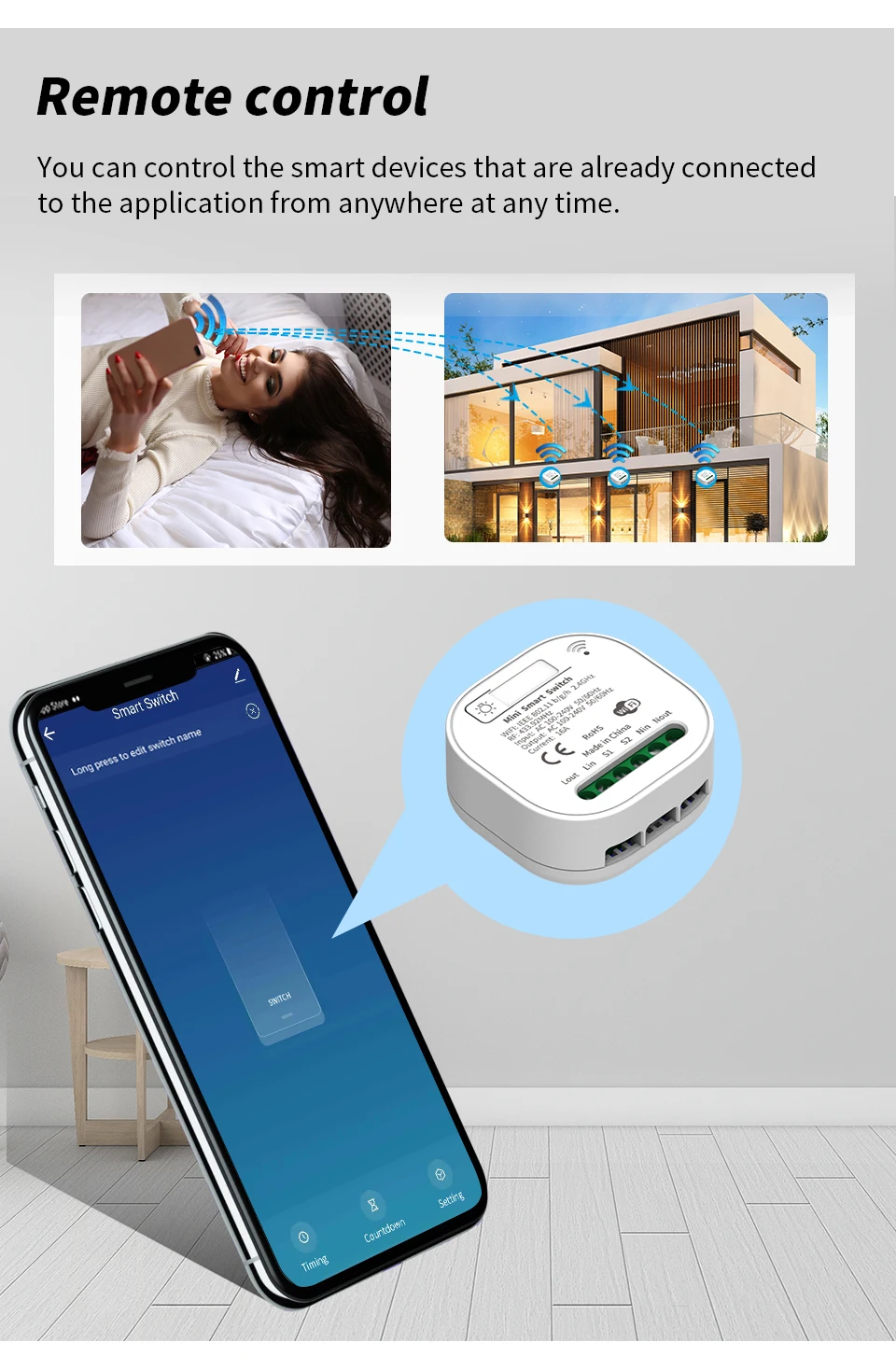 Этот умный wifi модуль с мини-дизайном подходит для настенного переключателя, И легко спрятать его в вашу скрытую коробку переключателя стены вашего традиционного переключателя без каких-либо влияний на ваш оригинальный стиль украшения, чтобы сделать его умным.!
