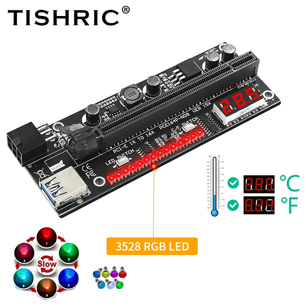 Райзер TISHRIC PCIE 15x Plus PCI-E 16X, Райзер VER15x, карта Райзера, 6-контактный разъем питания, 14 светодиодов, индикатор температуры для майнинга биткоинов