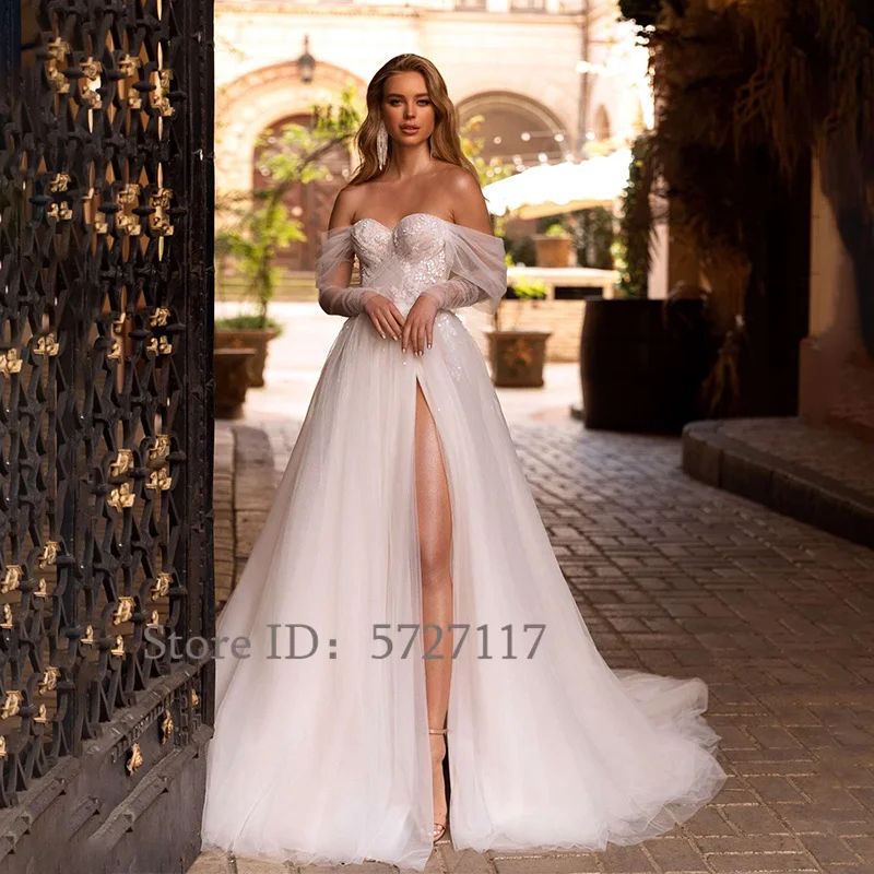 Модные кружевные пляжные свадебные платья с вырезом сердечком и аппликацией длинное ТРАПЕЦИЕВИДНОЕ ПЛАТЬЕ ИЗ ТЮЛЯ С Высоким Разрезом и открытыми плечами для невесты