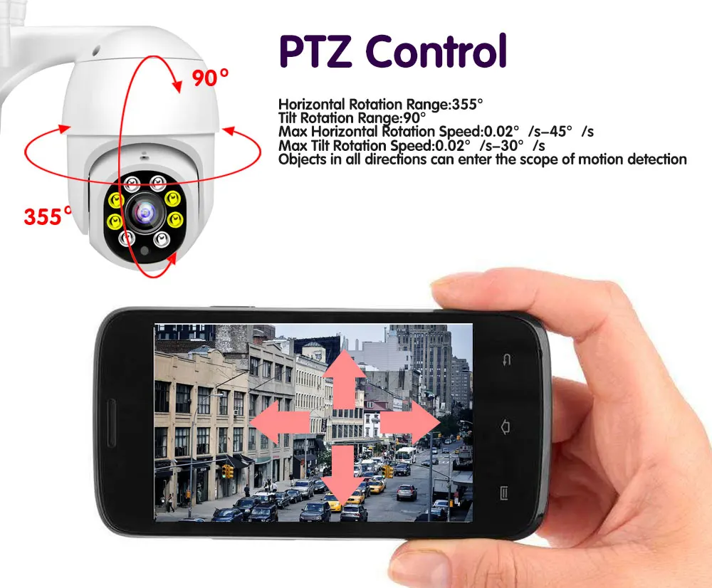 Поворачивается на 355 ° по горизонтали и на 90 ° по вертикали. Вы можете управлять им непосредственно в приложении, когда захотите и где бы вы ни находились.