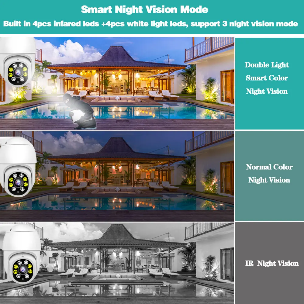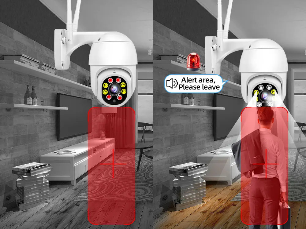 Когда человек проходит через зону сигнализации, камера обнаруживает движение человека. В то же время, 4 белый светодиодный светильник s будет светильник, чтобы показать ночной цвет.