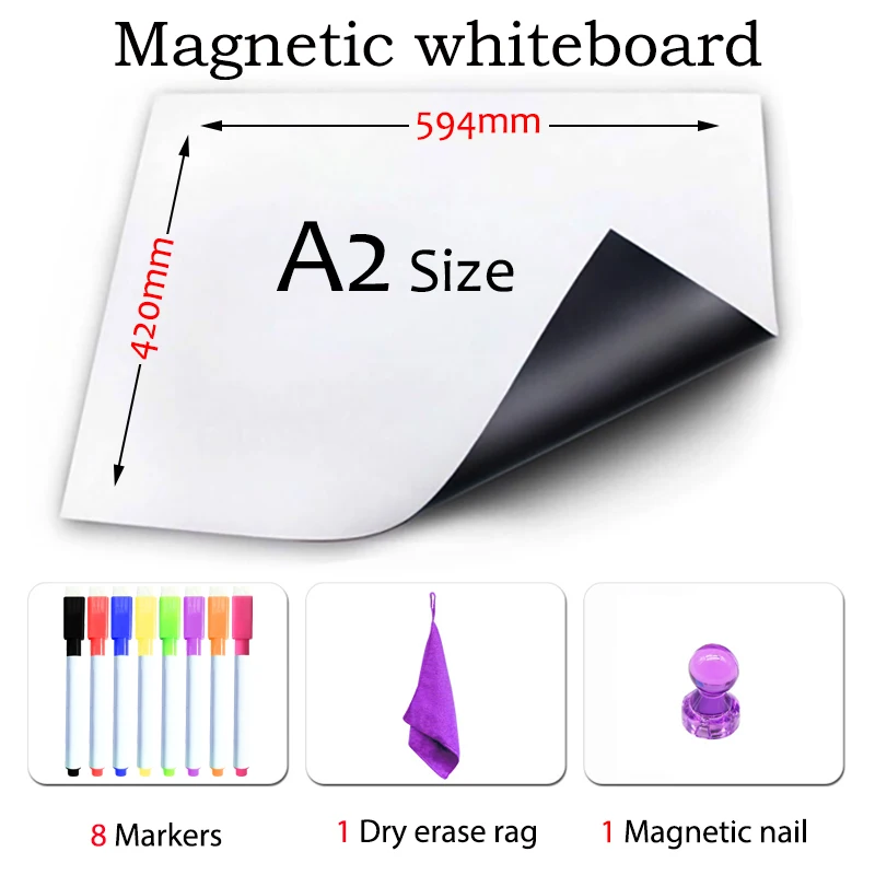Поверхность ПЭТ-пленки, гладкая Идеально подходит для написания важных заметок, которые необходимо запоминать и помочь вам организовать Сухая салфетка легко очищается Цвет ластика будет отправлен случайным образом Белая доскаРазмер:A2420 мм x 594 мм Посылка включает в себя: 1 х белая доска, 8 ручек, 1 сухая тряпка, 1 Магнитный гвоздь.