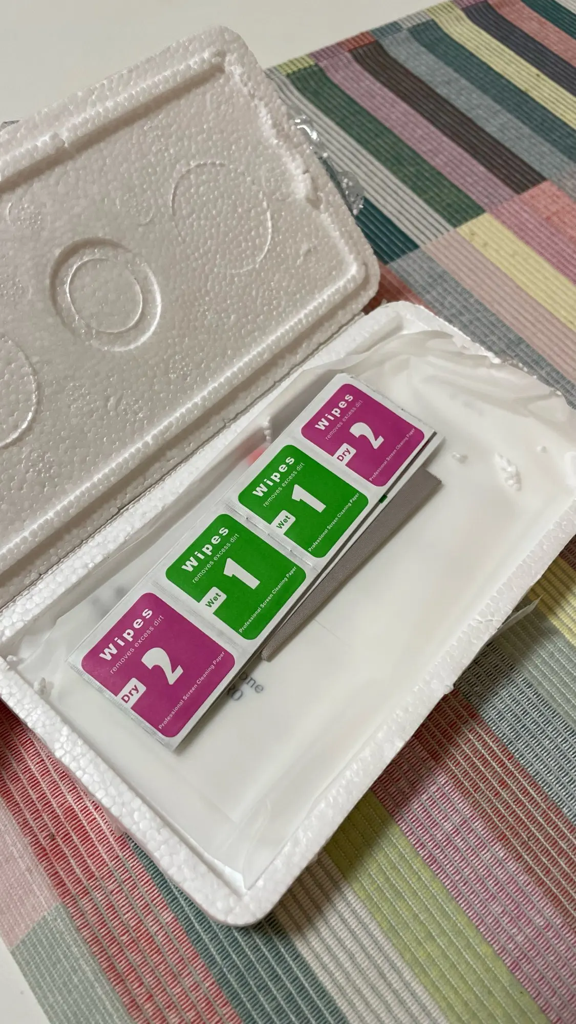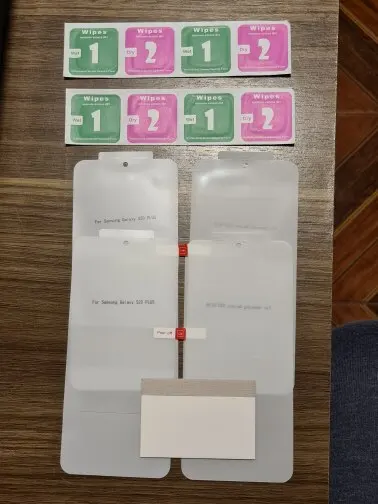 все, как описано : 4 пленки, 4 набора салфеток, приспособление для разглаживания пленки. Очень надёжно упаковано, в пенопластовую коробку, пришло без повреждений. Пока ещё не использовала, надеюсь, все получится. Продавцу спасибо.