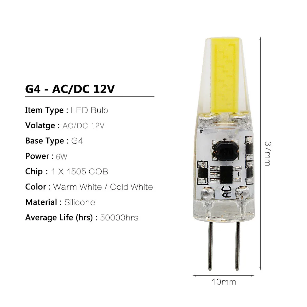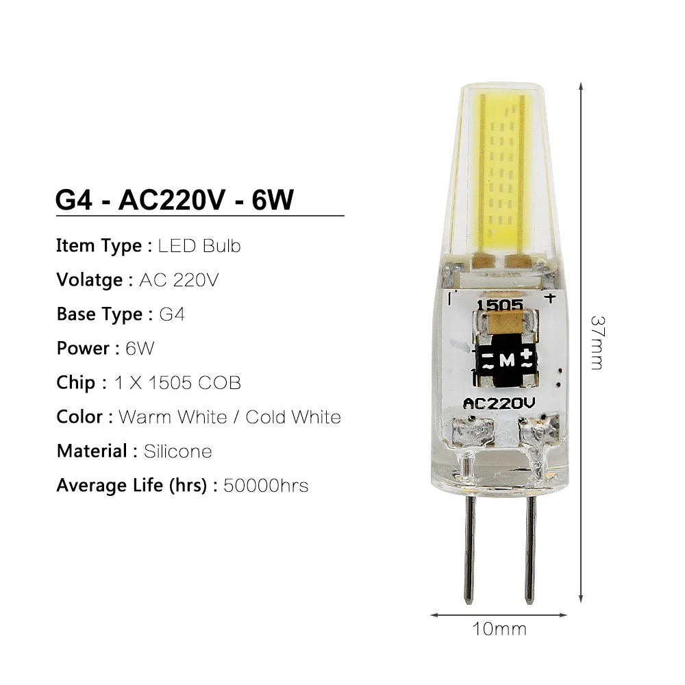 Название продукта: светодиодный светильникМощность: 6 ВтТип основания: G4Светодиодный чип-Модель: COB светодиодныйНапряжение: 12 В переменного/постоянного тока или 220 В переменного токаМатериал корпуса: силиконЦветовая температура:Теплый белый: 2800-3200KХолодный белый: 6000-6500KРазмер: 37*10 мм (длина * диаметр)