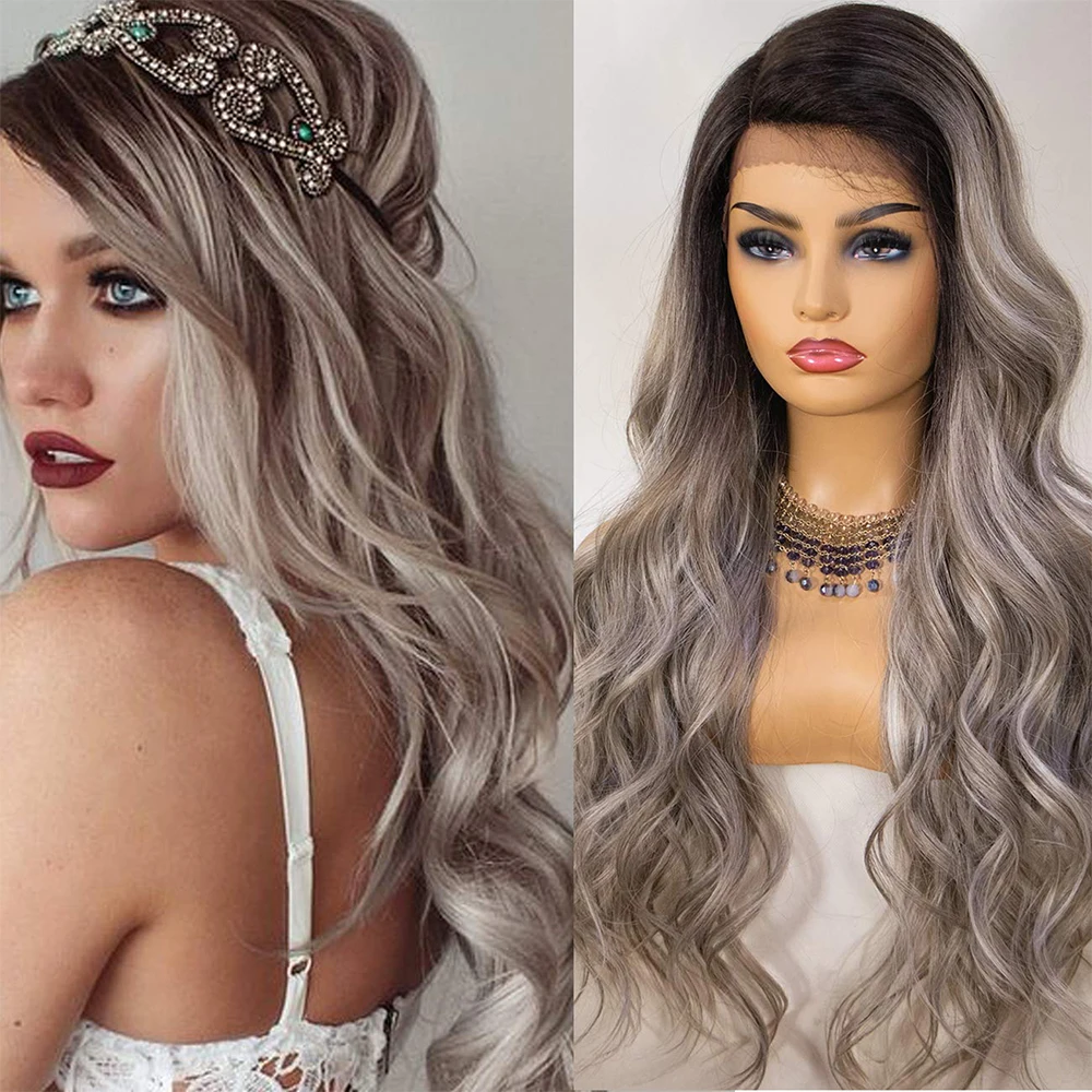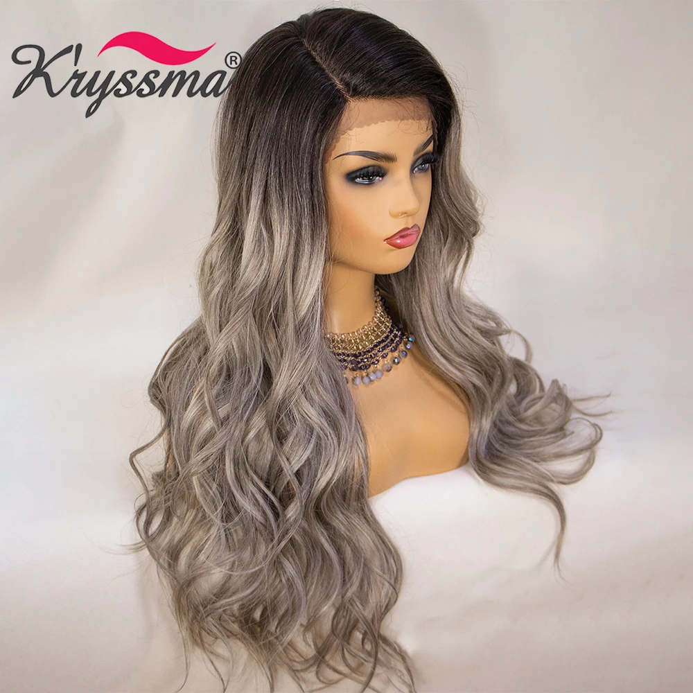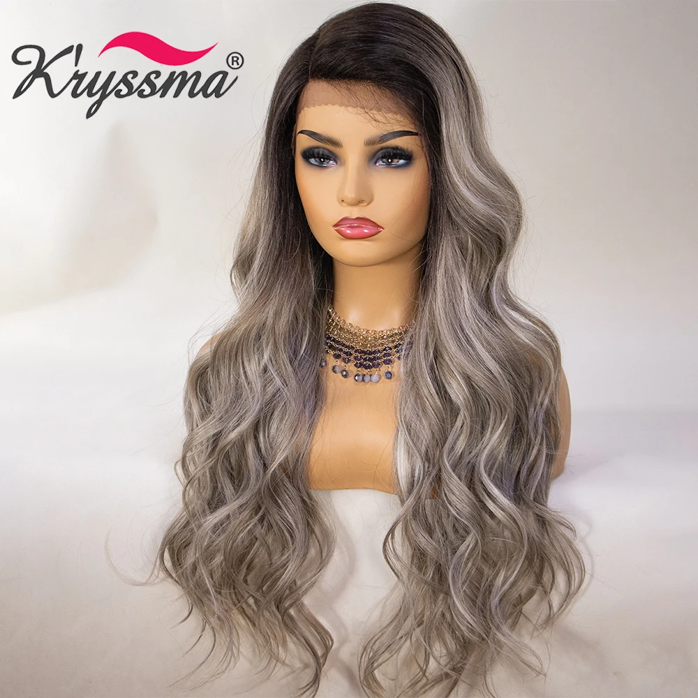 Kryssma, парики для косплея, парики из синтетического кружева спереди, пепельно-блонд, длинные волнистые синтетические парики для женщин, парики для косплея с черными корнями, Термостойкое волокно, афро-американские