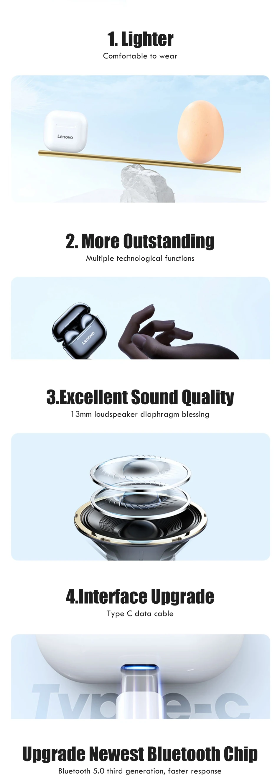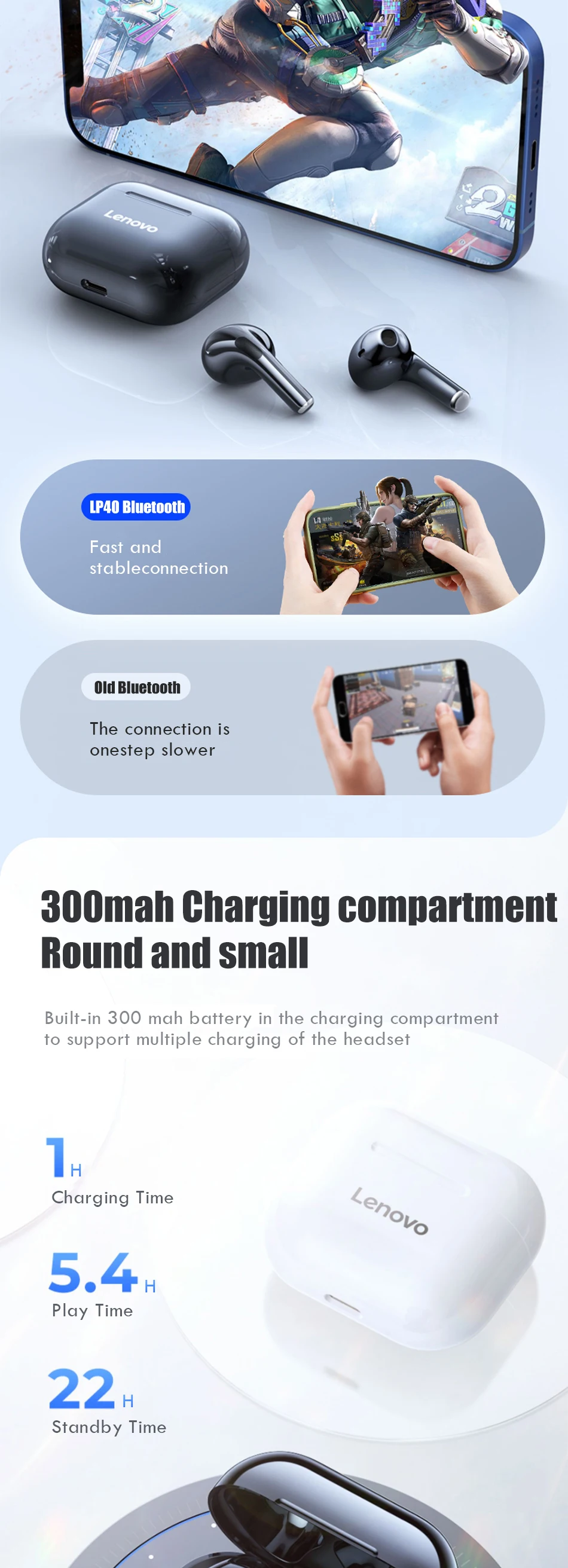 · [Оригинальная продукция]: оригинальные беспроводные наушники Lenovo LP40 дают вам совершенно новый музыкальный опыт с высоким качеством звука.· 【Сенсорное управление: Эти ушные крючки в значительной степени могут минимизировать давление на уши при прикосновении к кнопке для различных функций.· 【Bluetooth 5,0 】: использование самой передовой технологии Bluetooth 5. 0, вам не нужно беспокоиться о отключении.· 【Easy Pairing】: Возьмите две гарнитуры из зарядный чехол, и они будут соединяться друг с другом автоматически, тогда только один шаг легко войти в мобильный телефон Bluetooth настройки для сопряжения наушников, который обеспечивает стереозвук in-call. Также имеет быструю и стабильную передачу без запутывания.