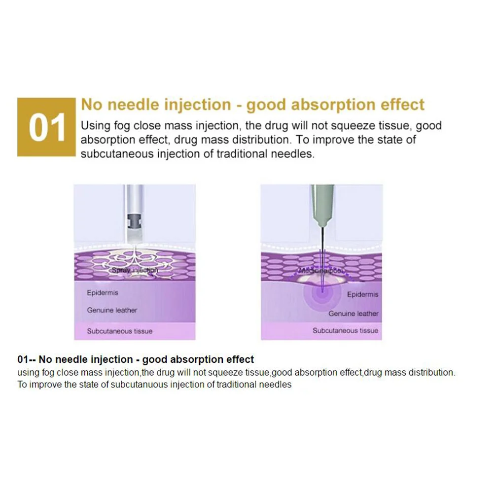 * Безболезненная инъекция* Инъекция без иглы устраняет риск заражения иглой*Не оставляет шрамов и следов от проколов кожи иглой*Лучшее и быстрое усвоение лекарственных средств*Строго Подкожная инъекция-устраняет риск проникновения препарата в мышцы*Быстро, легко и безопасно*Отдельная и экономичная дозировка препарата