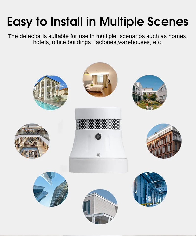 При обнаружении дыма и пожаров, звуковой сигнал до 85 дБ будет выдан с красным миганием светодиодный светильник и отправлен в мобильное приложение для защиты безопасности всей семьи.