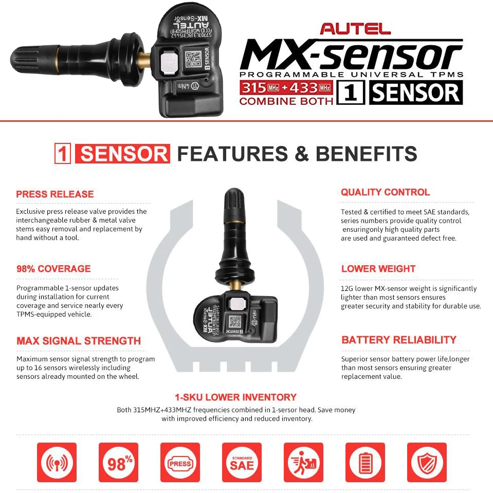 1. 2 в 1 особенность: только 1 датчик для обслуживания почти всех TPMS оборудованных транспортных средств для снижения стоимости ремонта и более высокой эффективности установки без необходимости повторного обучения. MX-Sensor является 100% cloneable с оригинальным идентификатором датчика и помещается в том же положении.2. 98% покрытия: с новейшим и наиболее полным покрытием 98% OE датчиков на рынке, и до 90% североамериканских, европейских и азиатских транспортных средств, он почти подходит для всех типов колес в дороге.3. Простота в использовании: Максимальная сила сигнала датчика позволяет легко программировать датчики без проводов, даже когда они уже установлены на колесо. Кроме того, уникальная конструкция клапана с пресс-релизом делает замену ручного датчика намного проще.4. Прочный и долговечный: оснащен автомобильным аккумулятором, сменным алюминиевым/резиновым стержнем клапана, выдерживающим холодную, горячую и стойкую коррозию, и высокоточным воздушным клапаном для предотвращения утечки воздуха, этот датчик обеспечивает превосходную стабильность и производительность.5. Гарантия: Autel гарантирует, что датчик не имеет материала и дефектов производства в течение 24 месяцев или 24000 миль. Каждый датчик отмечен серийным номером для отслеживания качества датчика с завода, чтобы гарантировать, что установлены только высококачественные детали.