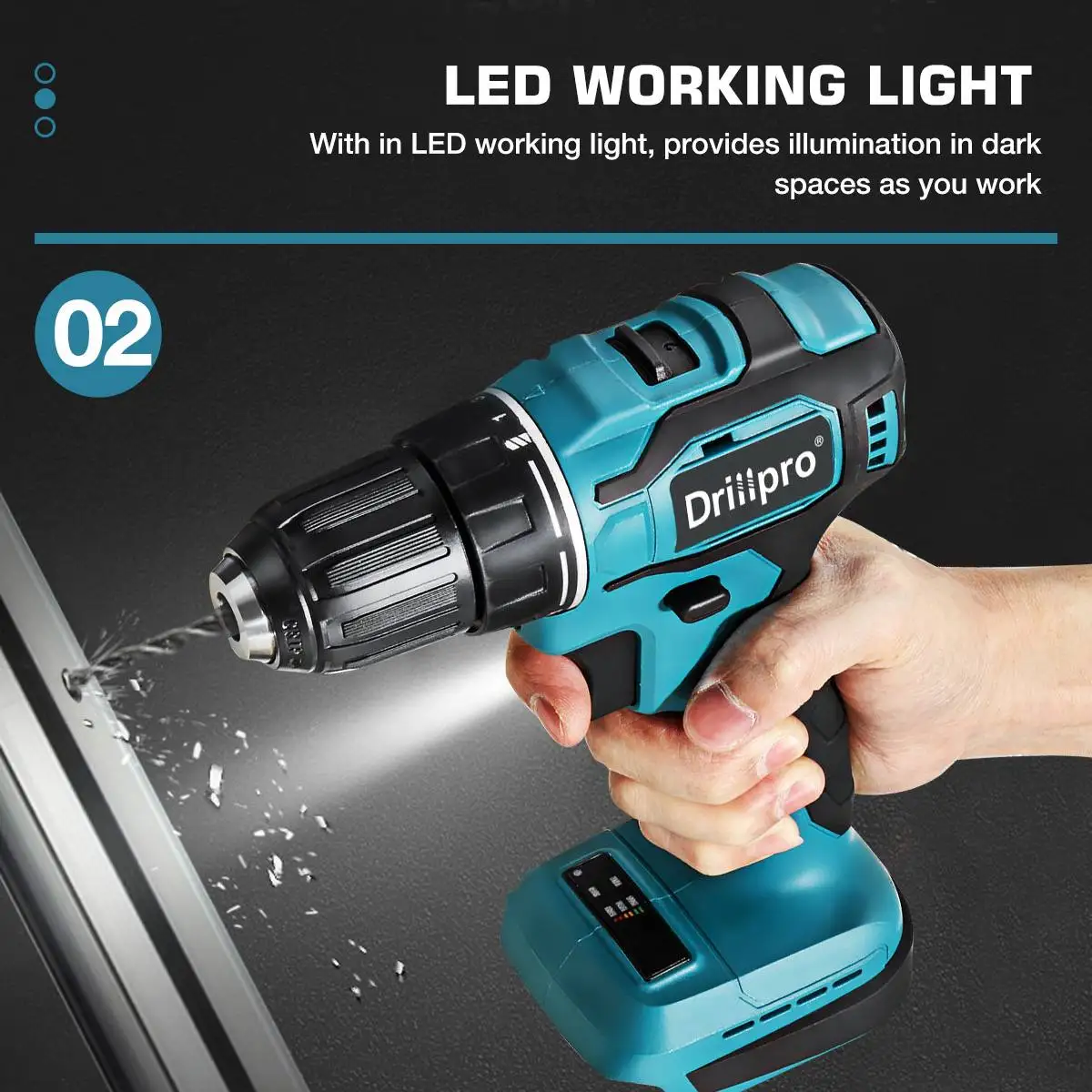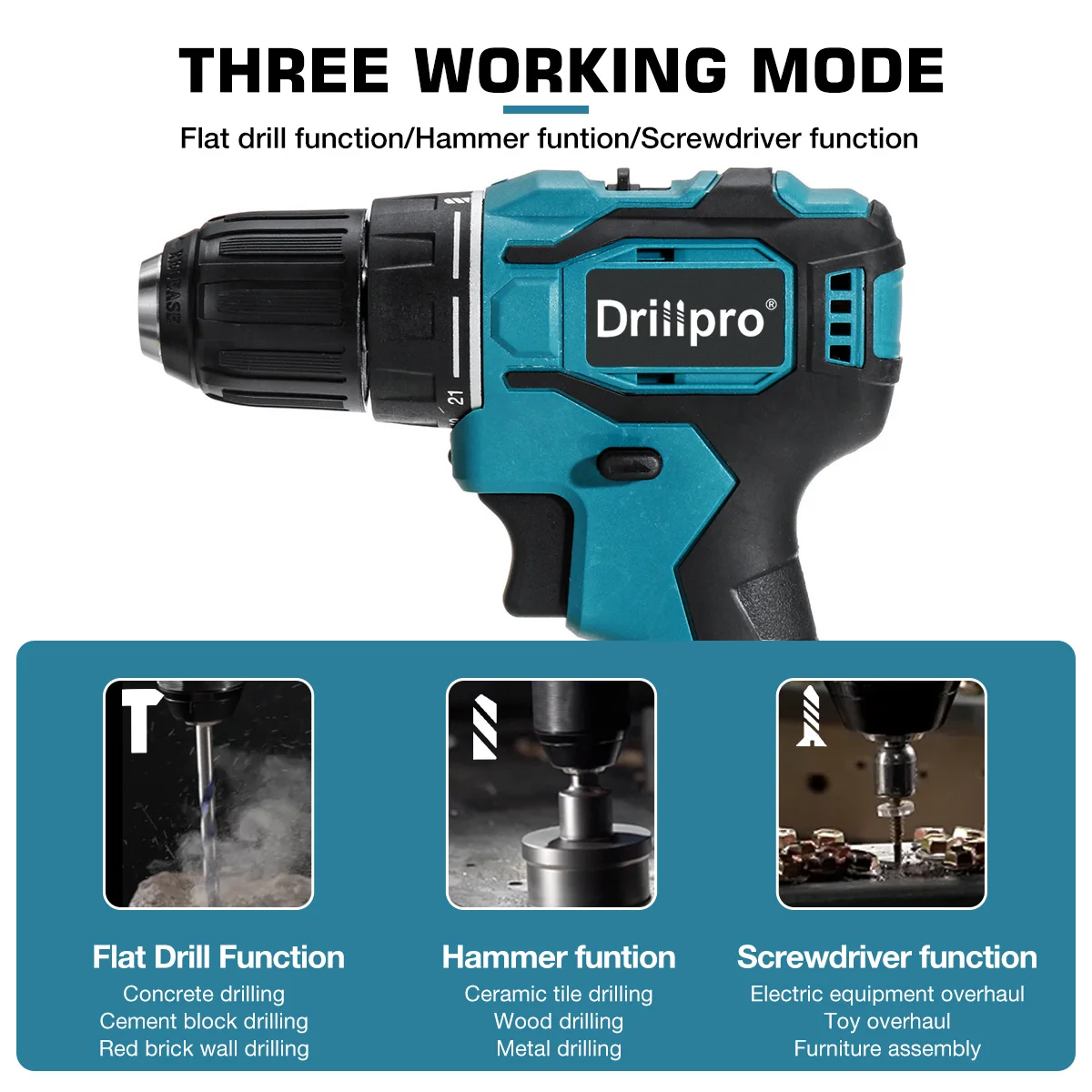 Эксплуатация-Обеспечивает до 90 Н. М крутящего момента и 1800 об/мин скорости-21 + 1 этап настройки, обеспечивает 21 крутящий момент и режим сверления для высокой точности работы-1/2 "без ключа трехкулачковый сверлильный патрон для быстрой и простой замены бит, удерживая до 13 мм бит-Светодиодный Светильник обеспечивает освещение в темных пространствах при работе-С кнопкой для управления вперед и обратного вращения, нажимая его вправо, отвертка будет вращаться против часовой стрелки;Нажав его налево, отвертка будет вращаться по часовой стрелке; Нажатие на него посередине будит переключатель.