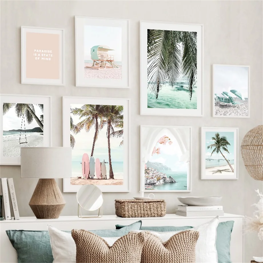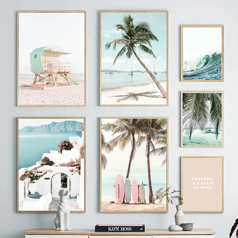 Европейское здание, кокосовое дерево, Пляжная настенная Картина на холсте, скандинавские постеры и принты, настенные картины для декора гостиной