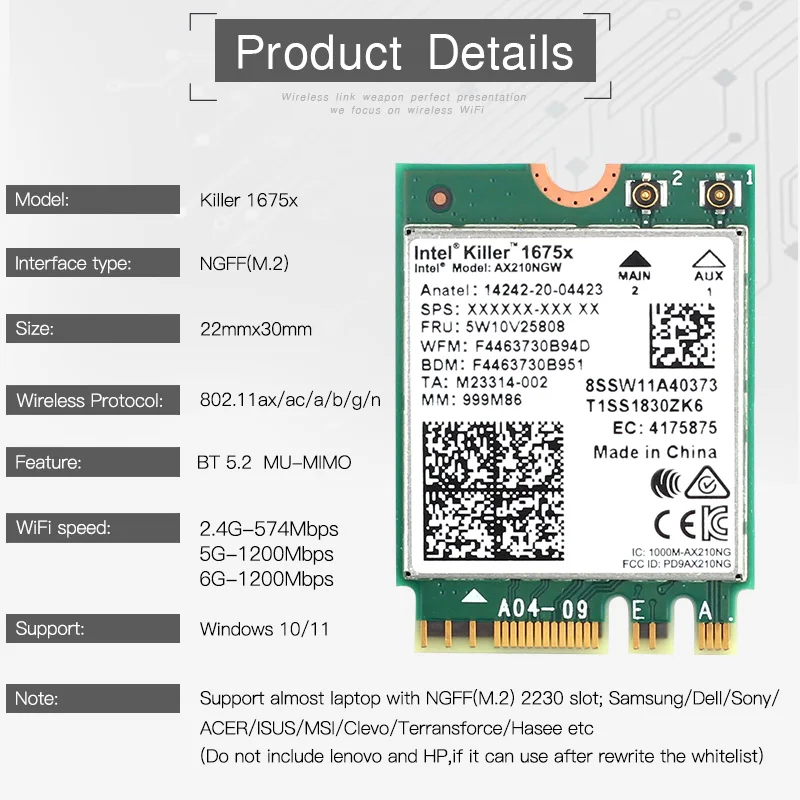 Беспроводная сетевая карта killer 1675X, 5374 Мбитс, совместимая с ...
