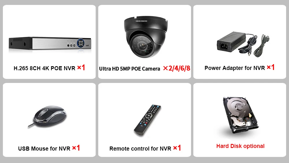 1 сетевой видеорегистратор 8CH 4K POE NVR;2/4/6/8 X HD POE IP 5.0MP для дома и улицы ИК Ночного Видения Всепогодные камеры;1 X Блок питания для NVR;1 х USB мышь для NVR;1 компакт-диск программного обеспечения для NVR;1 пульт дистанционного управления для NVR;Жесткий диск опционально!