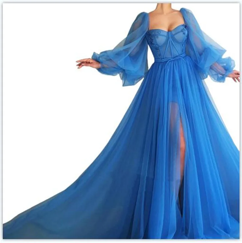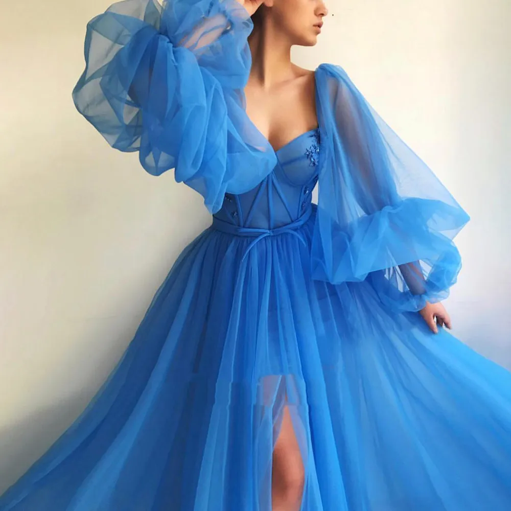 Платье ТРАПЕЦИЕВИДНОЕ с лямкой на шее, вечернее простое синее платье в стиле Бома, с пышными рукавами, с открытыми косточками, с высоким разрезом, тюль, F