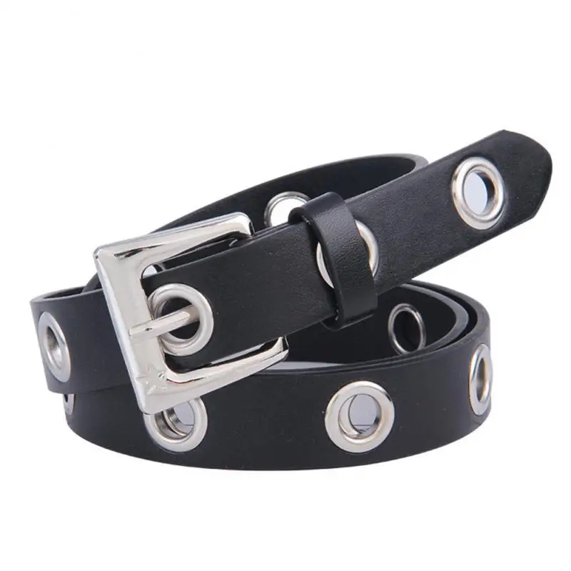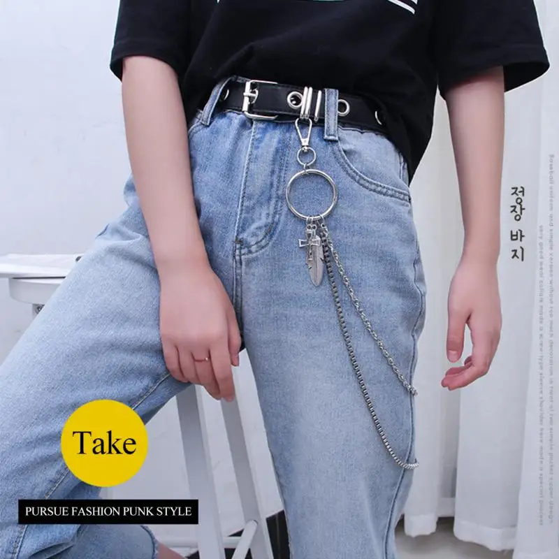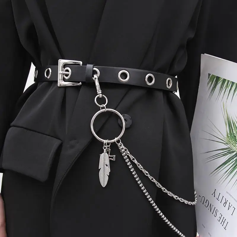 Ремень в стиле панк с цепочкой с отверстиями для женщин, универсальный трендовый декоративный пояс в хипстерском стиле, модные ремни для девушек, с металлическим кольцом-пробивкой и зажимом для брюк