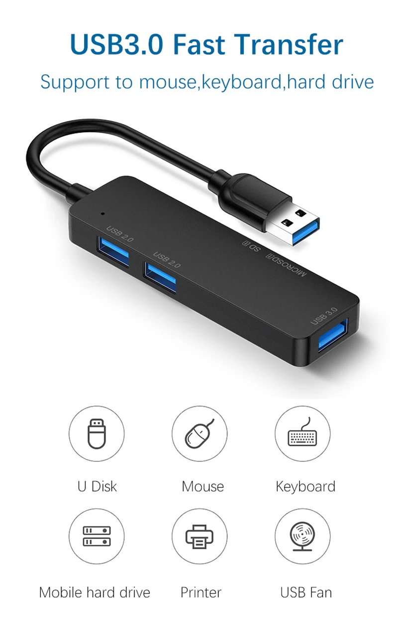 2, быстрая передача данных, 1 порт USB 3,0 концентратор, 3 порта USB 2,0, передача данных без ожидания, быстрая и эффективная.