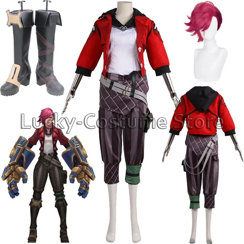 Костюм для косплея LoL Arcane Vi, женская обувь, костюмы на Хэллоуин, карнавал, Аниме Костюм для женщин и мужчин, топ и брюки, красное пальто
