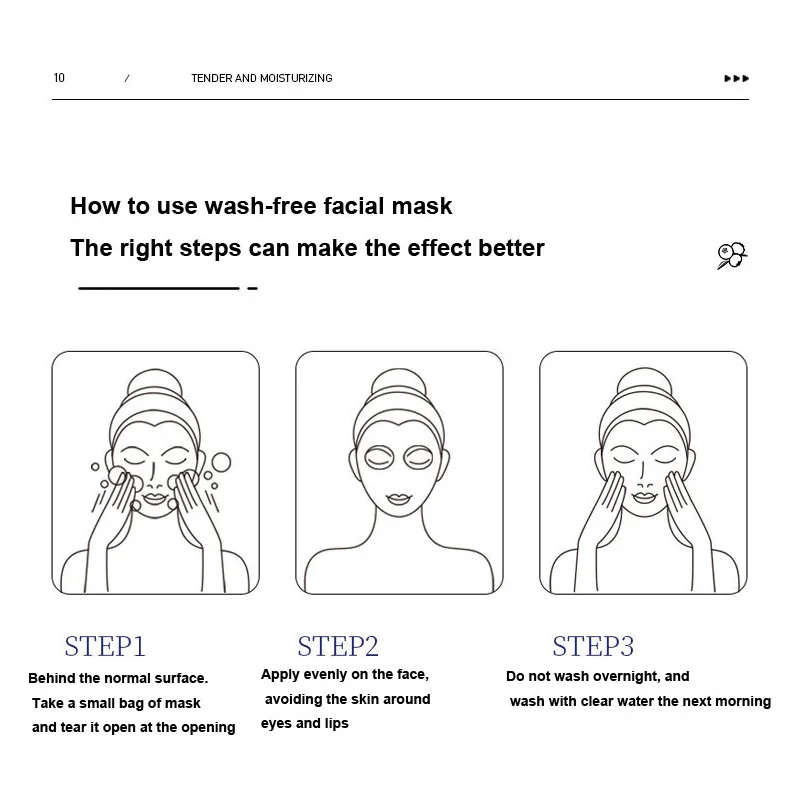 Использование:Перед сном и после очищения нанесите необходимое количество продукта равномерно на лицо (Избегайте кожи вокруг глаз и губ) и постирайте его на ночь без стирки. Краску с чистой водой на следующее утро.