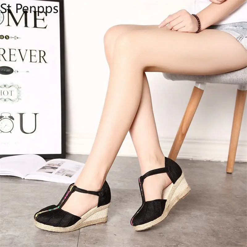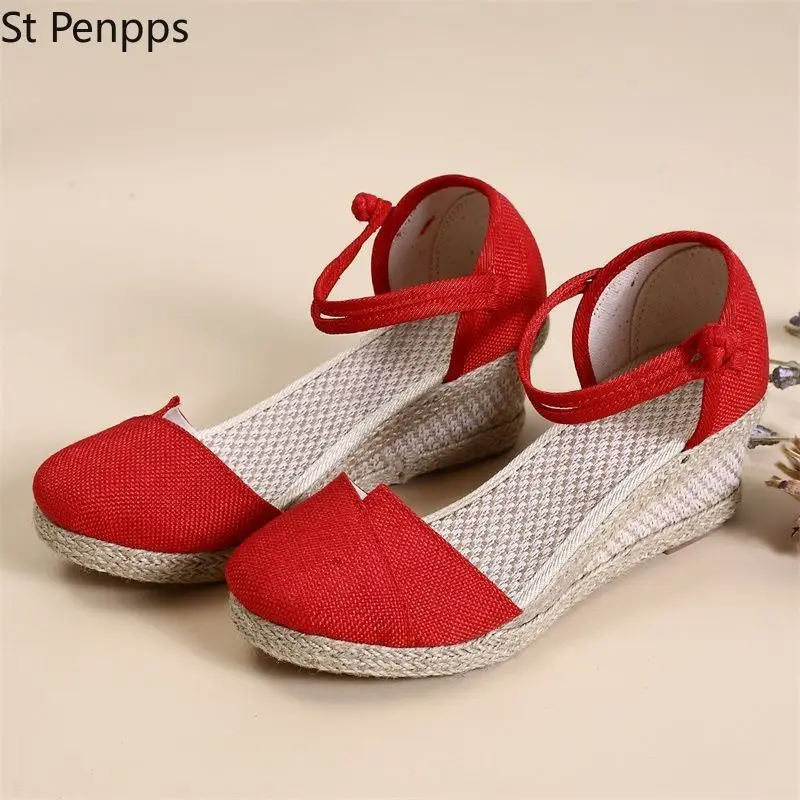 Богемные женские эспадрильи ручной работы из льна и хлопка на танкетке Летние удобные туфли на платформе и высоком каблуке с Т-образным ремешком