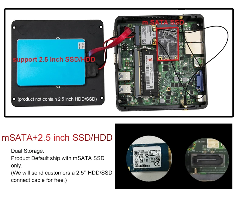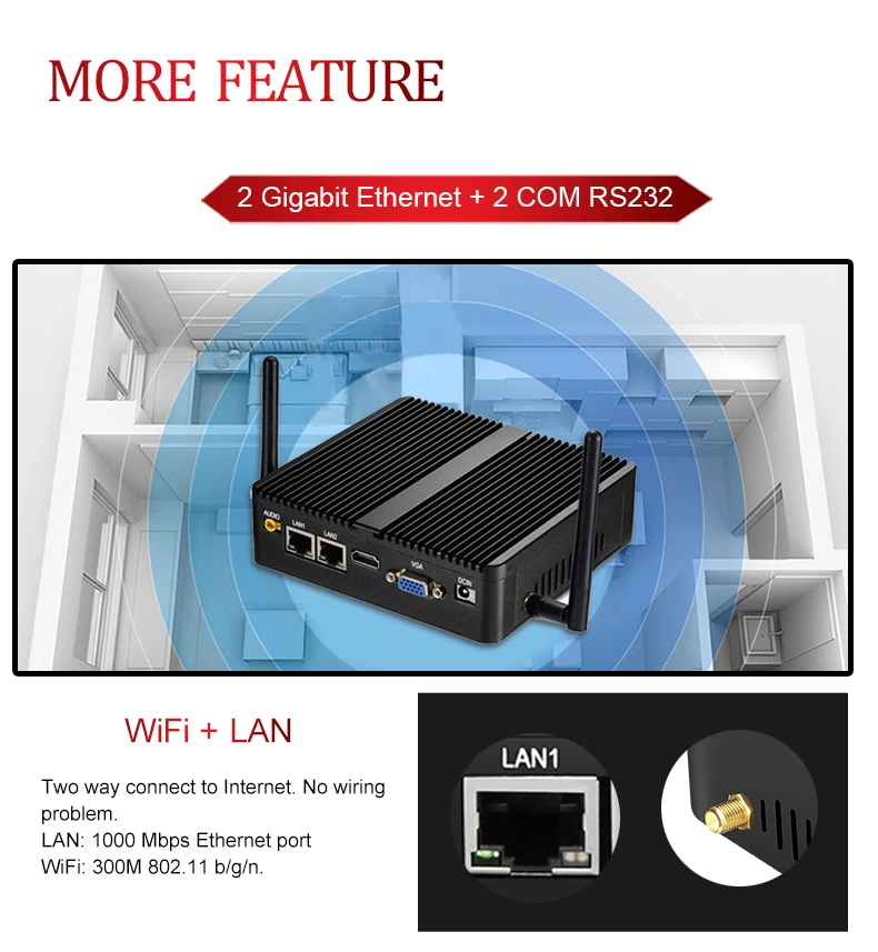 1. Поддержка Windows 10/8/7/Vista/Linux, Ubuntu, Pfsense и т. д.2. Съемная память и хранение для дополнительной гибкости, поддержка двойного хранения, сочетание одного mSATA SSD и один 2,5 дюймов жесткий диск или твердотельный жёсткий диск.3. Ультра-компактный мини-ПК masening 133x125x40 мм и легкий только 1,5 кг.4. Безвентиляторный мини-ПК пассивное охлаждение, шум zeor, поддержка 7x24 часов работы.5. Поддержка VESA-установлен на задней части дисплея, бесплатно отправить VESA крепление.